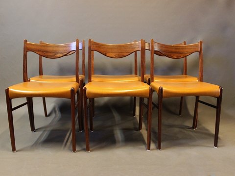 SoldThis set of 2 armchairs in rosewood with black leather cushions is a magnificent example of classic Danish design. The rosewood wood, with its deep color and fine grain, gives the chair a unique and luxurious radiance, while the soft, black leather ensures a comfortable sitting experience.