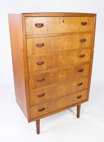 SoldChatol designed by Erling Torvits and made of rosewood. The upper part opens with a hinged door and has built-in drawers, open compartments, letter shelves and three integrated “secret” drawers in the top section. At the bottom, six spacious drawers with molded handles.
