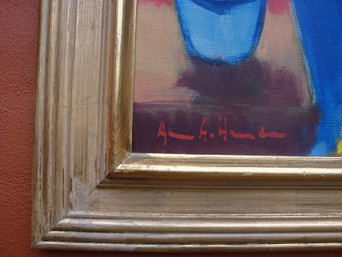 SolgtSmukt maleri i flotte klare farver. Fra 1940érne af Arne A. Hansen. H:65cm & B:55cm med ramme.