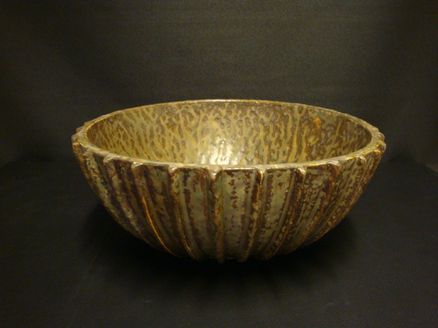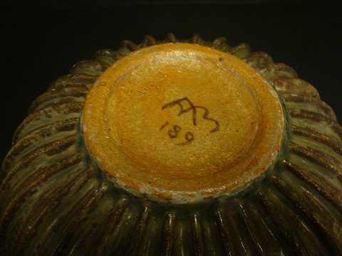 SolgtArne Bang skål udført i glaseret stentøj med vertikale rifler. Ø26cm og Højde 11cm. I perfekt stand.