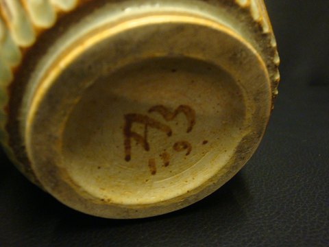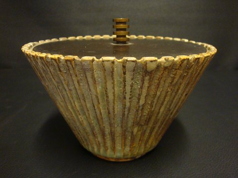 SoldArne Bang lidded ceramic with vertical fluting. Lid in bronze. Sign. AB 119th 9cm high and 14cm in diameter. in Beautiful condition.