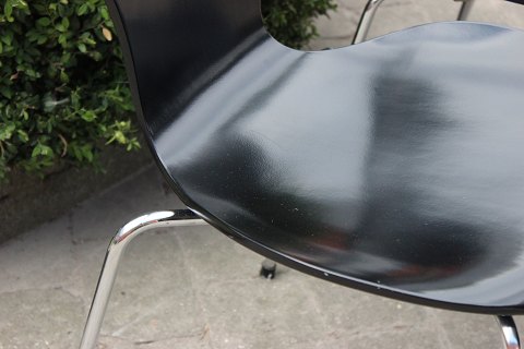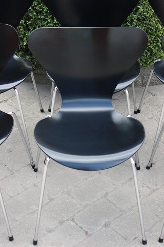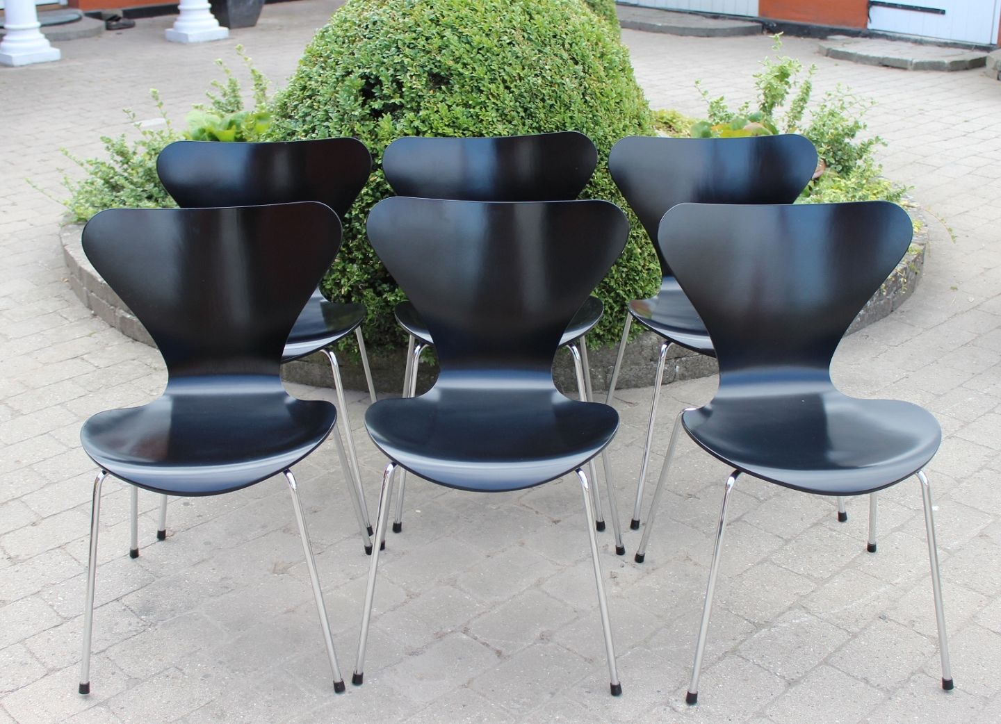 Sold6 Black seven chairs, model 3107, designed by Arne Jacobsen in the 1950s and manufactured by Fritz Hansen.