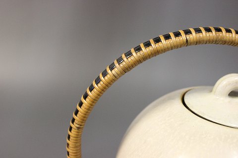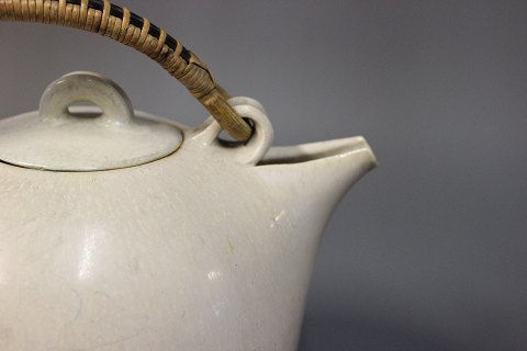 SoldWhite glazed stoneware teapot with bast handle from around the 1940s. The teapot is stamped Saxbo Denmark and with the no. 68, designed by Eva Stæhr Nielsen.