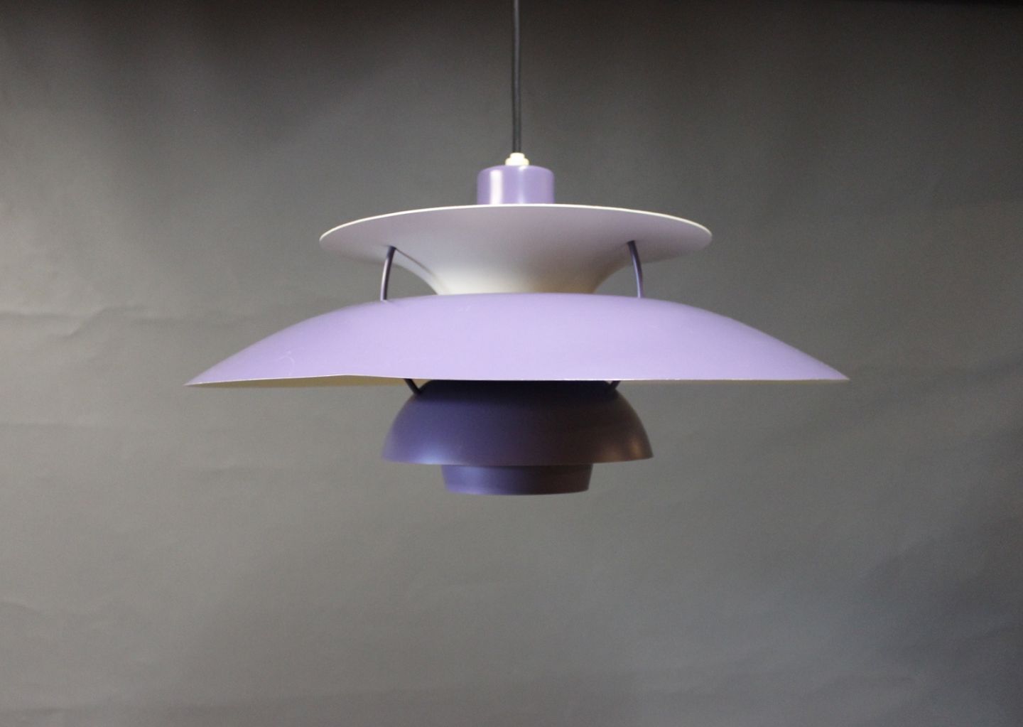 PH5 lampe designet af Poul Henningsen i 1958 og produceret af Louis Poulsen. Lampen har lilla lakerede metal skærme.