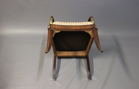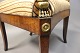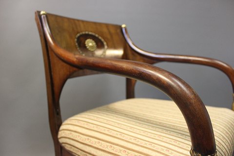 SoldArmchair in polished mahogany, inlaid fruitwood and decorated with brass and leaf gold. The chair was made in Germany in 1830 and upholstered in light fabric.
