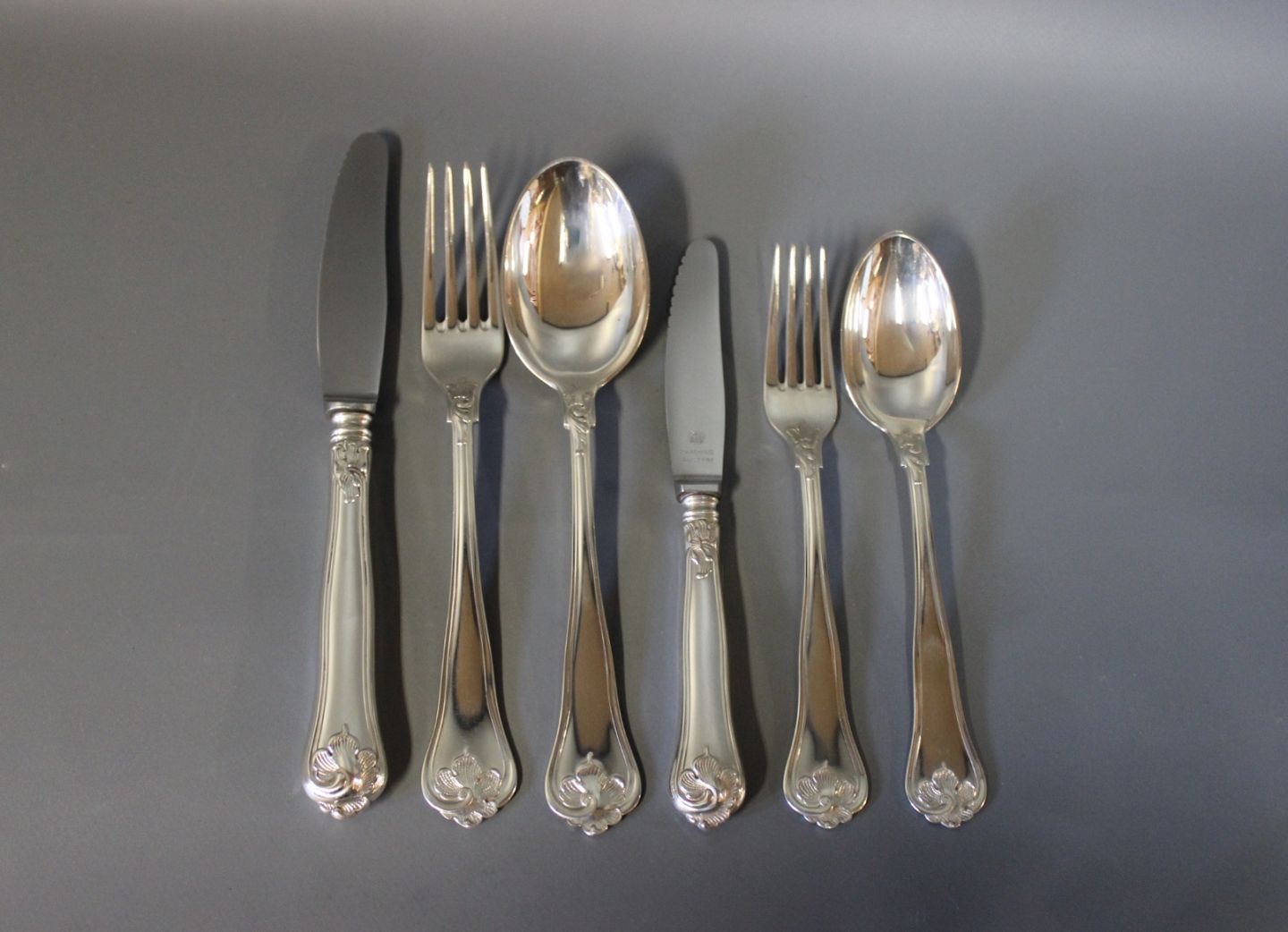 View the price in the text descriptionDinner set in Saxon, hallmarked silver. See prices and single Photos of the cutlery in this category.