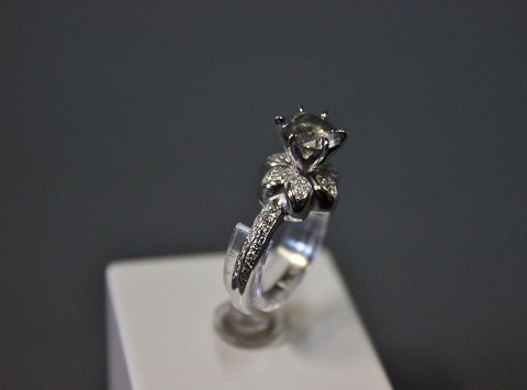 Ring in 14 ct. whitegold with large diamond, 1,8 ct., clarity P1, color grey/Brown along with smaller 0,4 ct. diamonds.