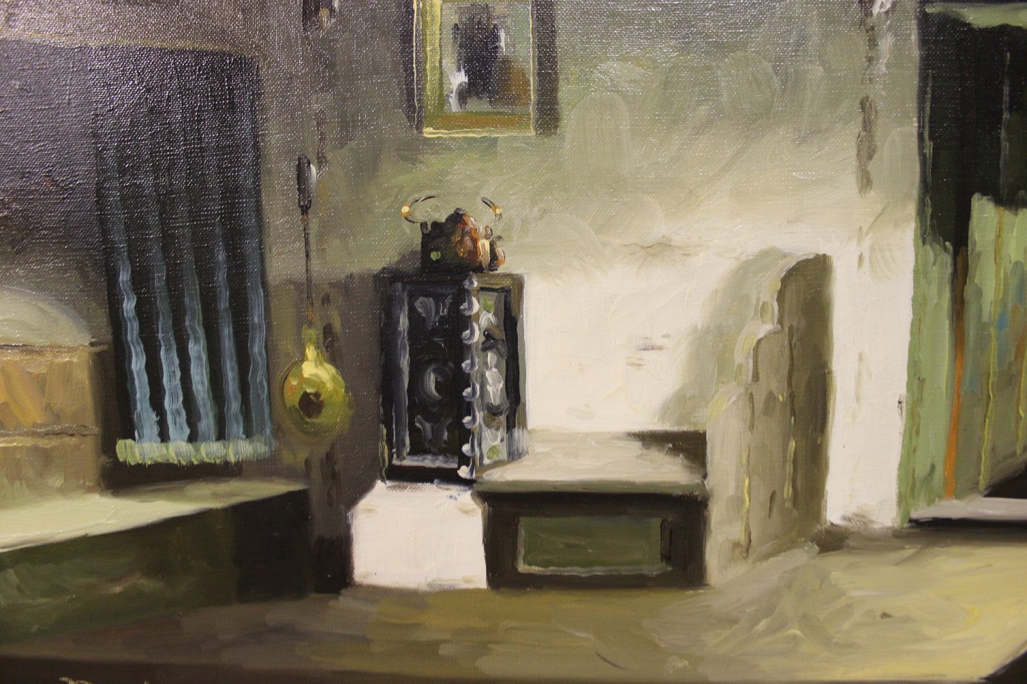 Oliemaleri af simpelt rum signeret Borch med træramme dekoreret med guldblad.