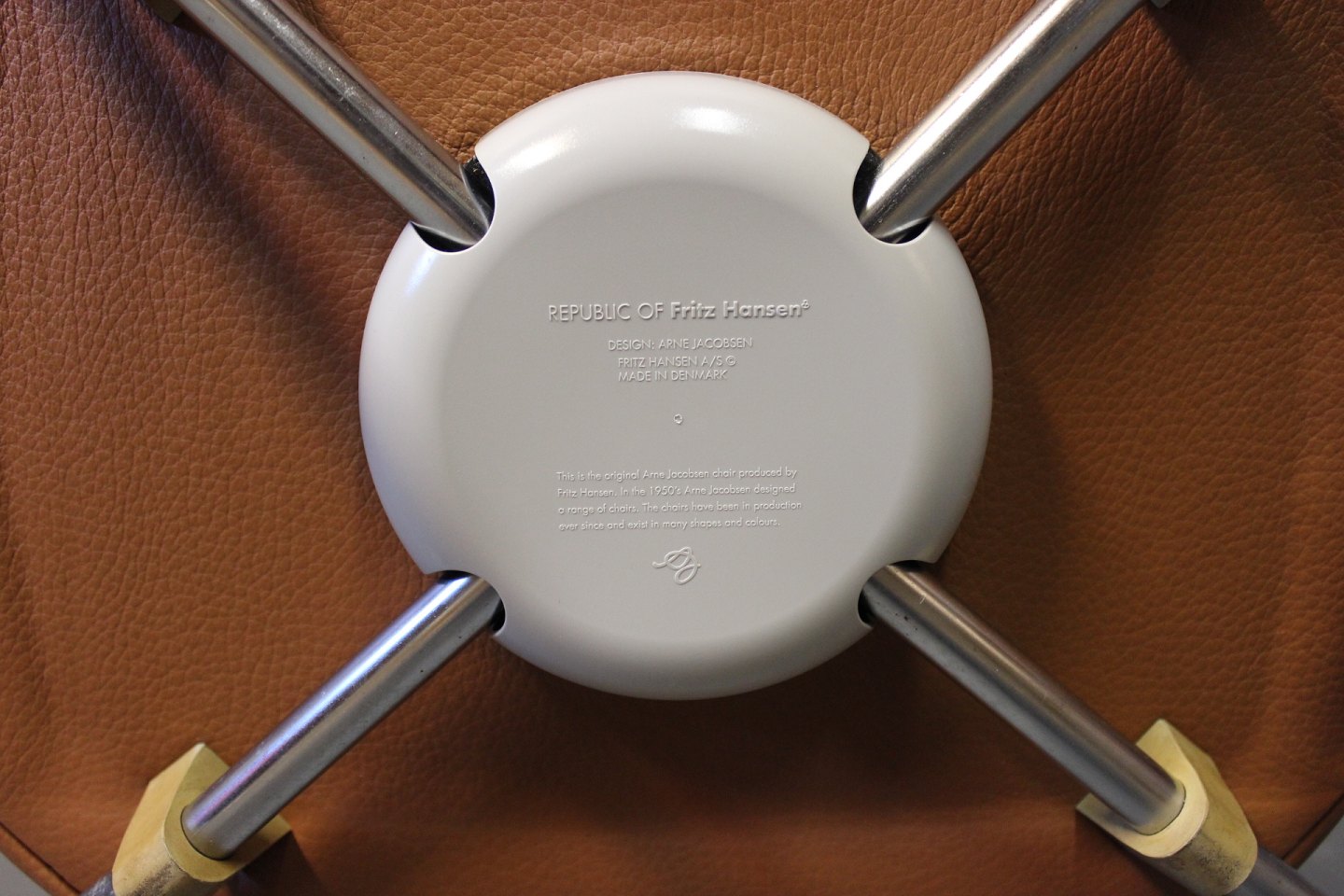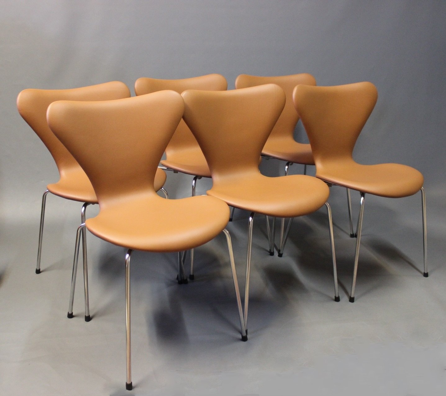 A set of 6 Seven chairs, model 3107, designed by Arne Jacobsen and manufactured by Fritz Hansen. The chairs have recently been upholstered in Classic cognac colored leather.