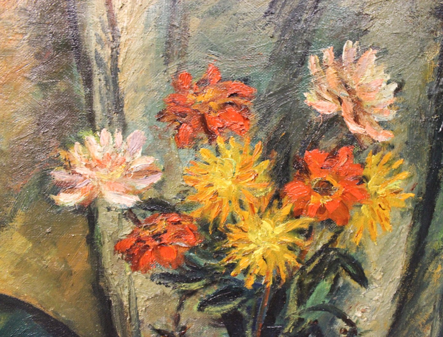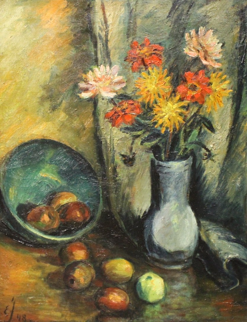 Oliemaleri på lærred i enkel ramme af Ejner Johansen fra 1948. Maleriet er med motiv af blomster og frugt.