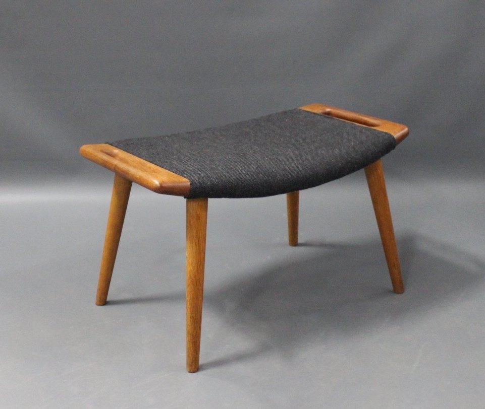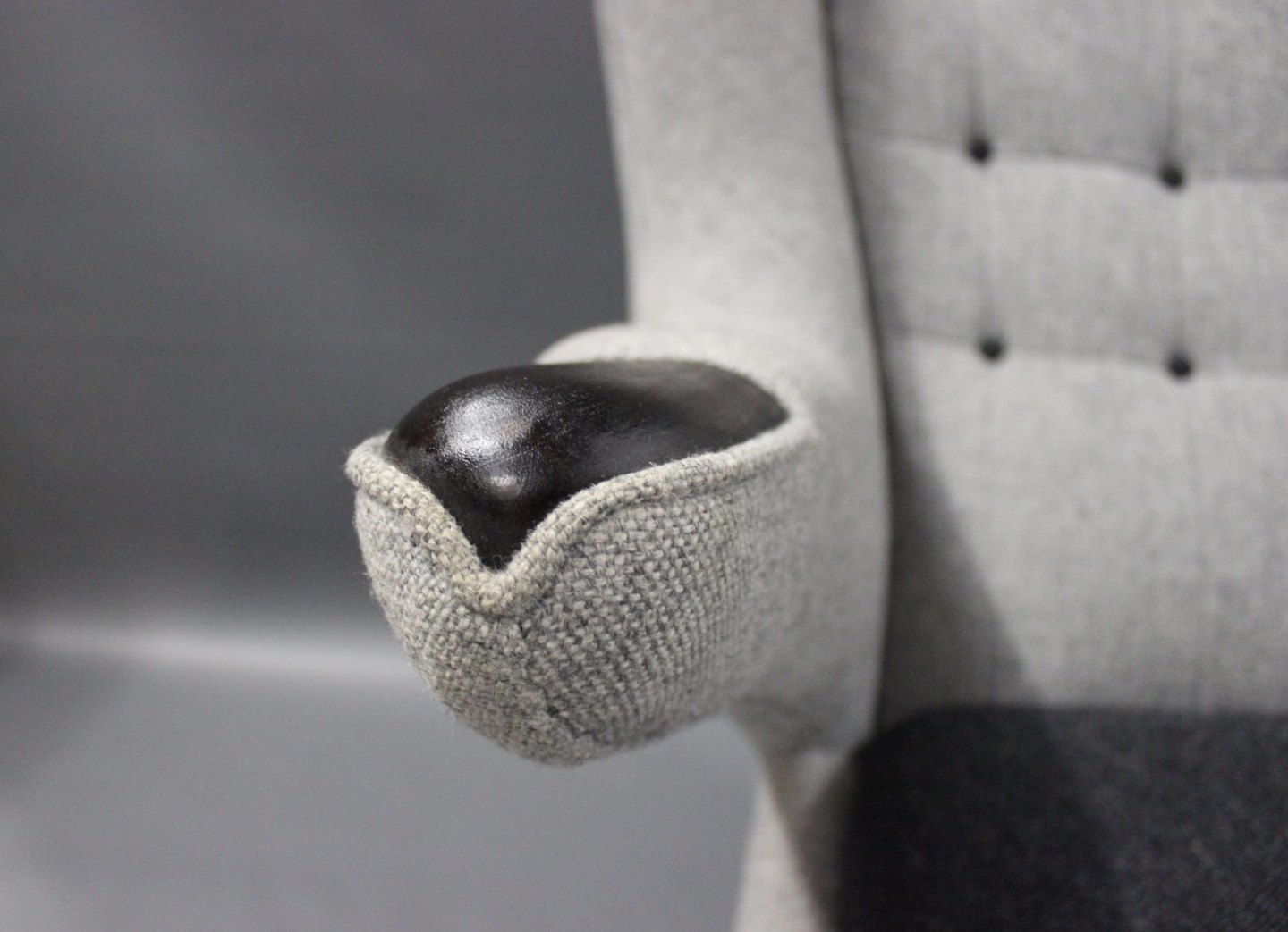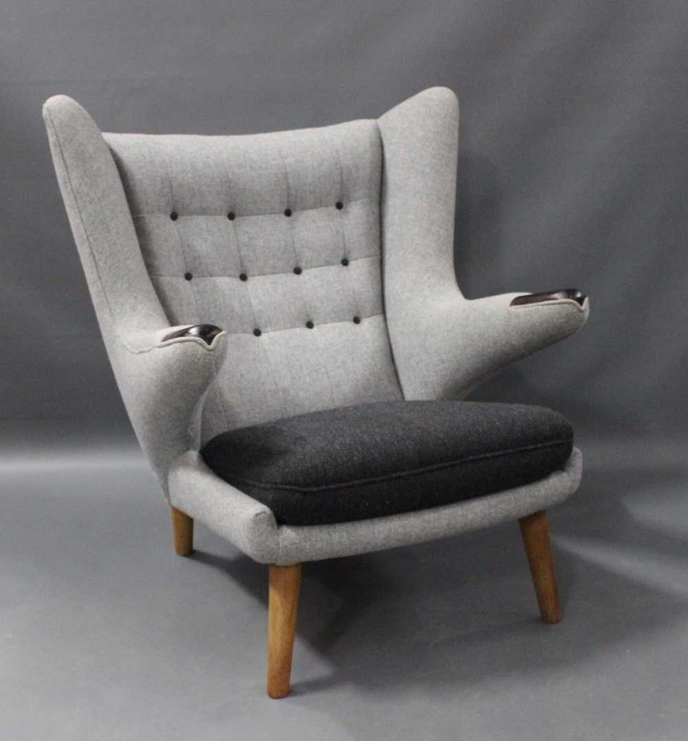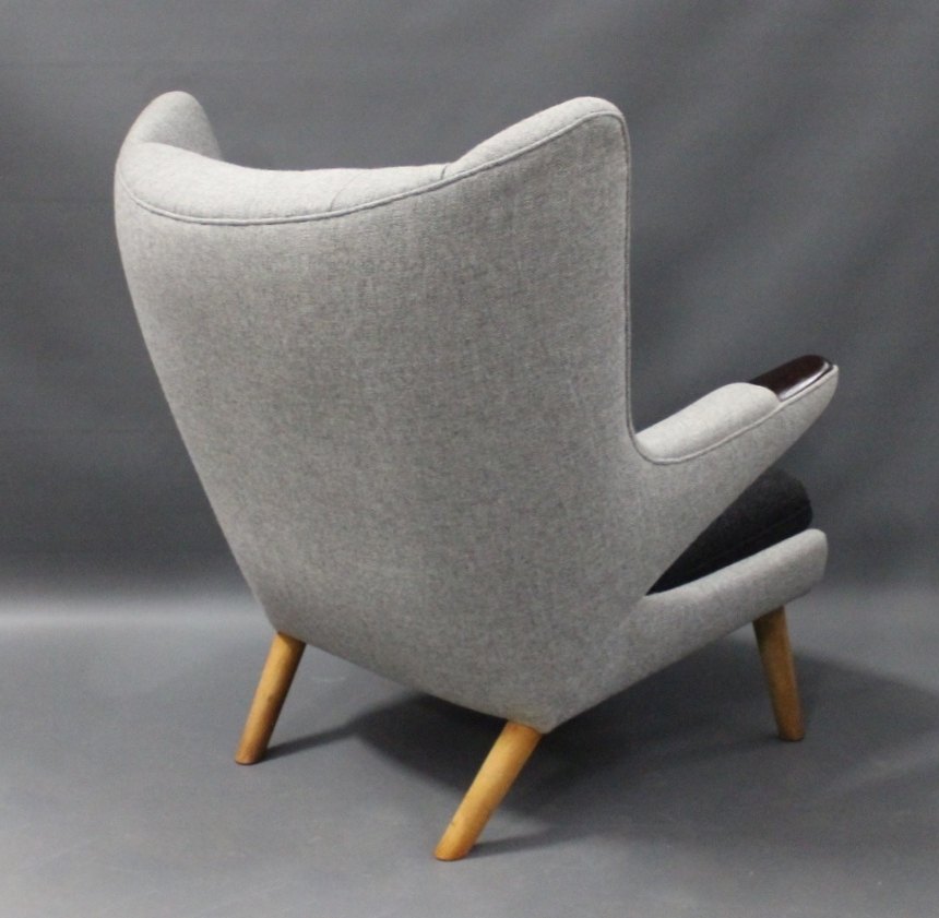 SoldPapa Bear chair, model AP 19, and stool model PP120, designed by Hans J. Wegner in 1951/54 and manufactured by A.P. Møbler. The chair is upholstery in light and dark grey Hallingdal wool, legs and paws of teak.