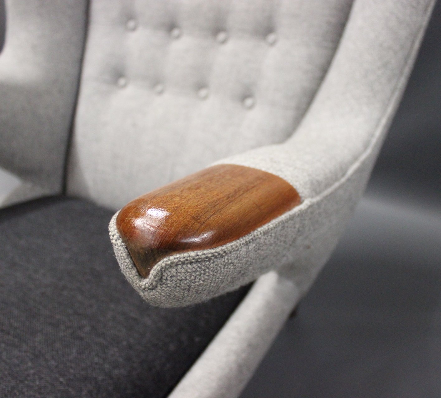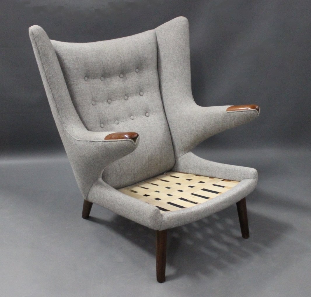 SolgtBamsestol, Model AP 19, designet af Hans J. Wegner i 1951 og produceret af A.P. Møbler. Stolen er polstret i lyst og mørke gråt Hallingdal uld, ben og "poter" af teak.