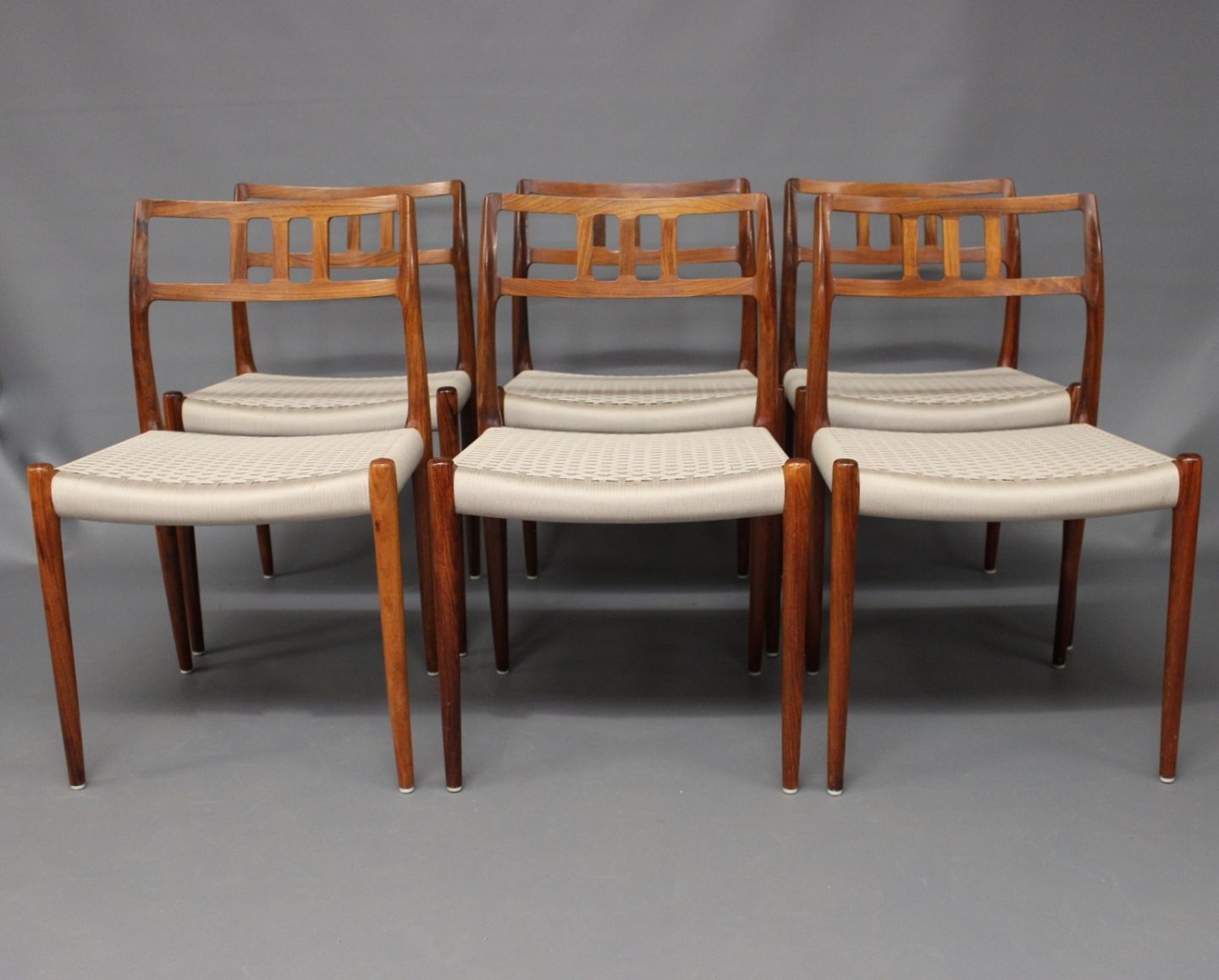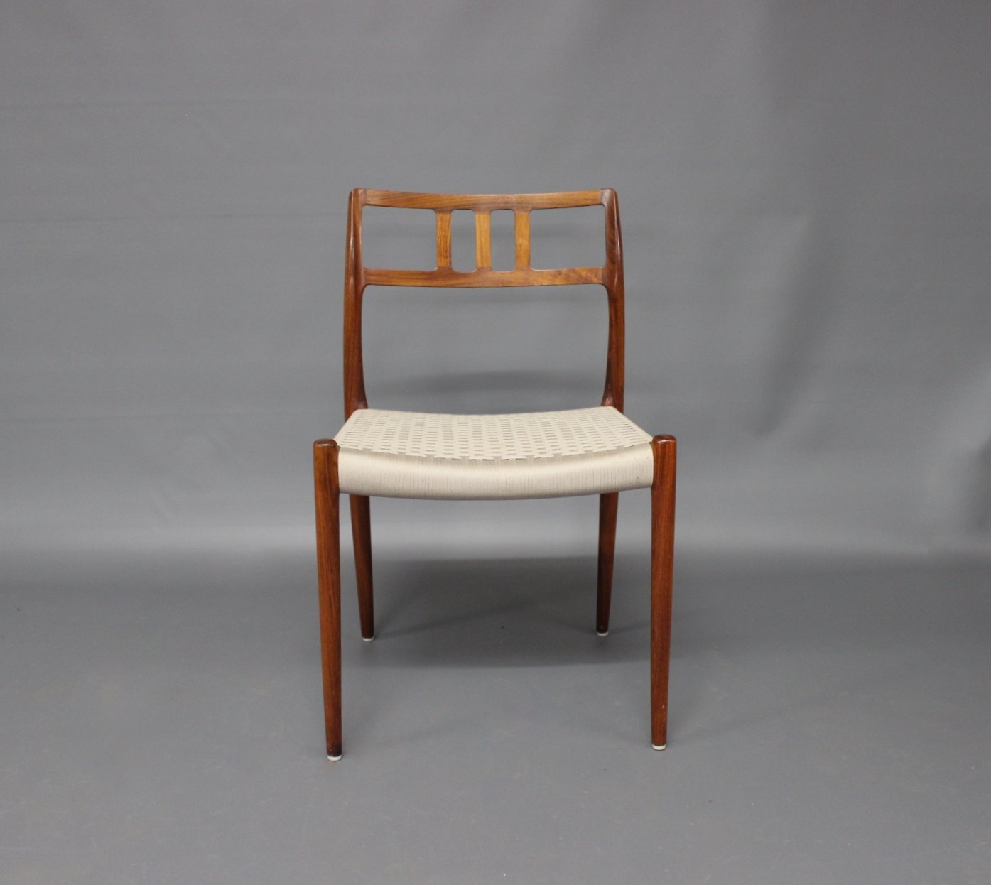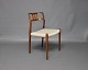 A set of six dining room chairs, model 79, designed by N.O. Moeller in 1966 and manufactured by J.L. Moeller in the late 1960s. The chairs are made of rosewood and light grey seats.