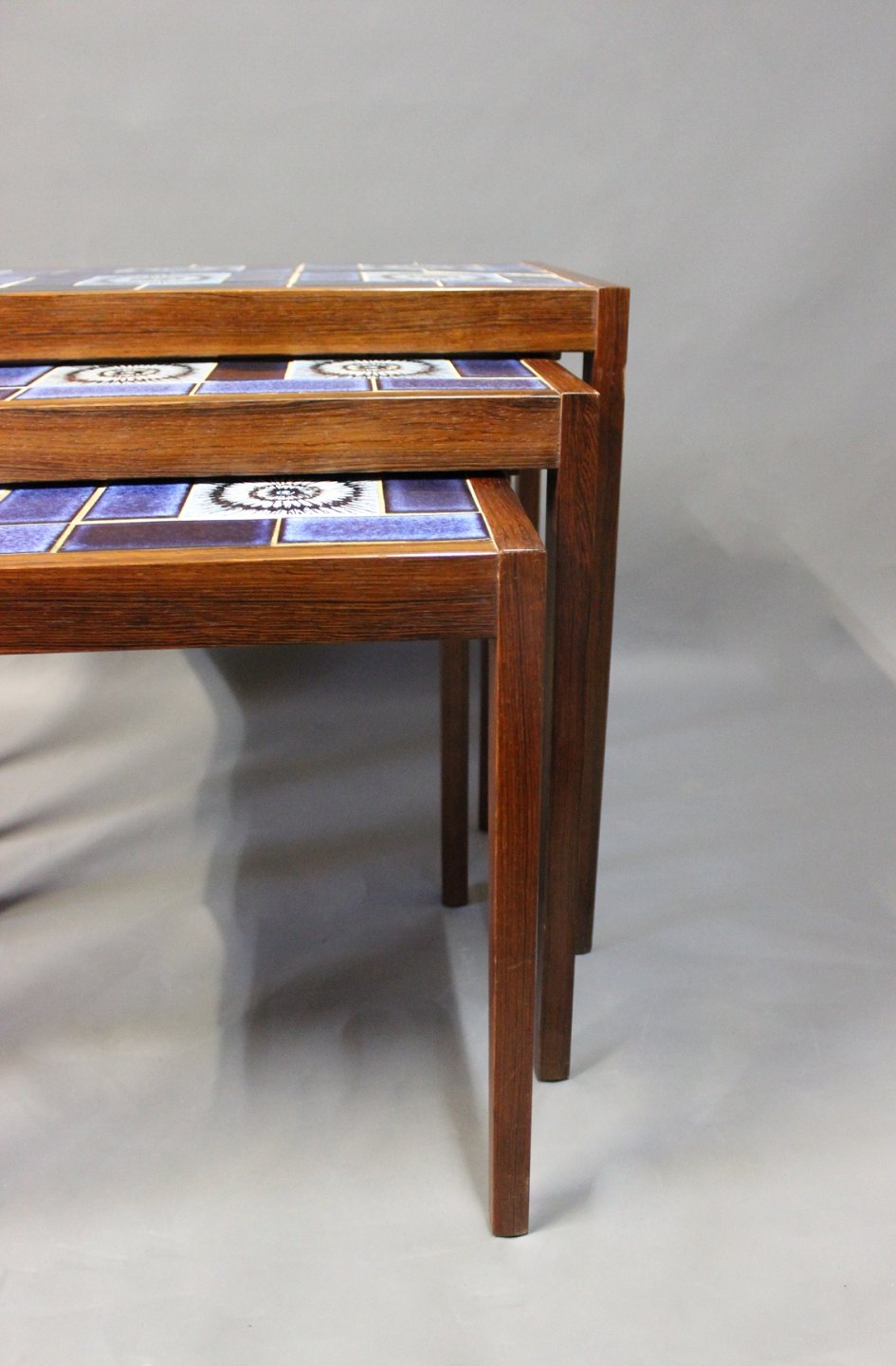 SoldA set of nesting tables in rosewood with tiles in blue colors, Danish Design from the 1960s.