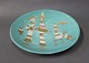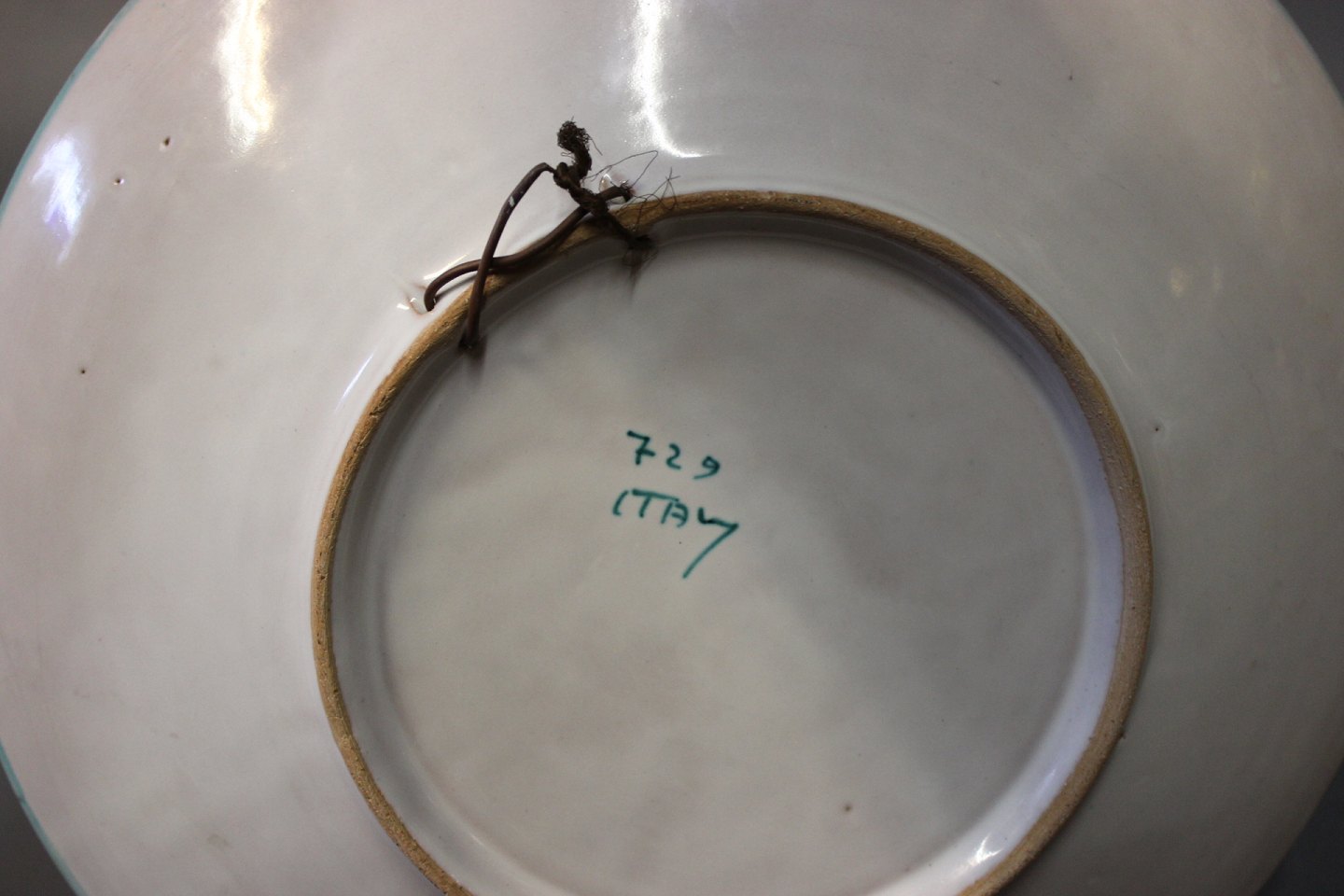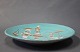 Large italian ceramic dish in turquoise glaze decorated with figures in gold. The dish is numbered 729.