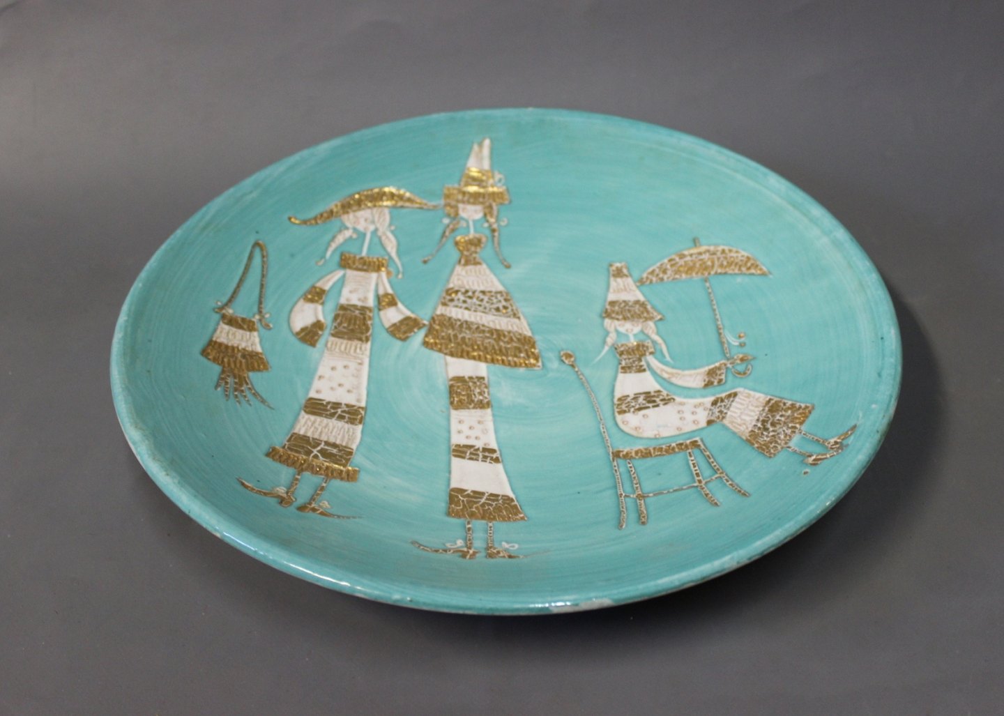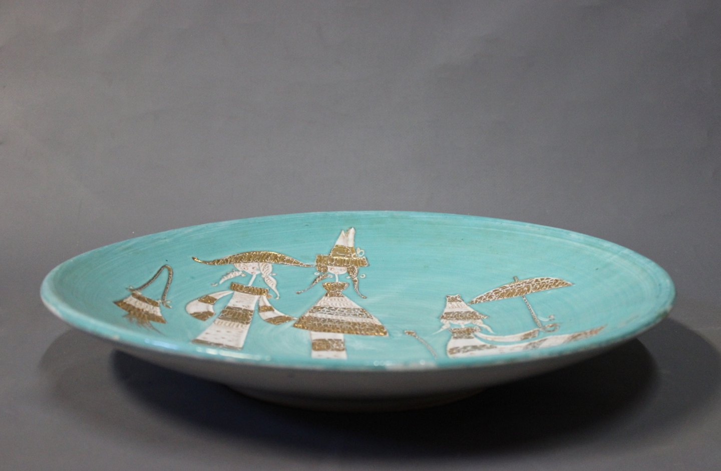 Large italian ceramic dish in turquoise glaze decorated with figures in gold.