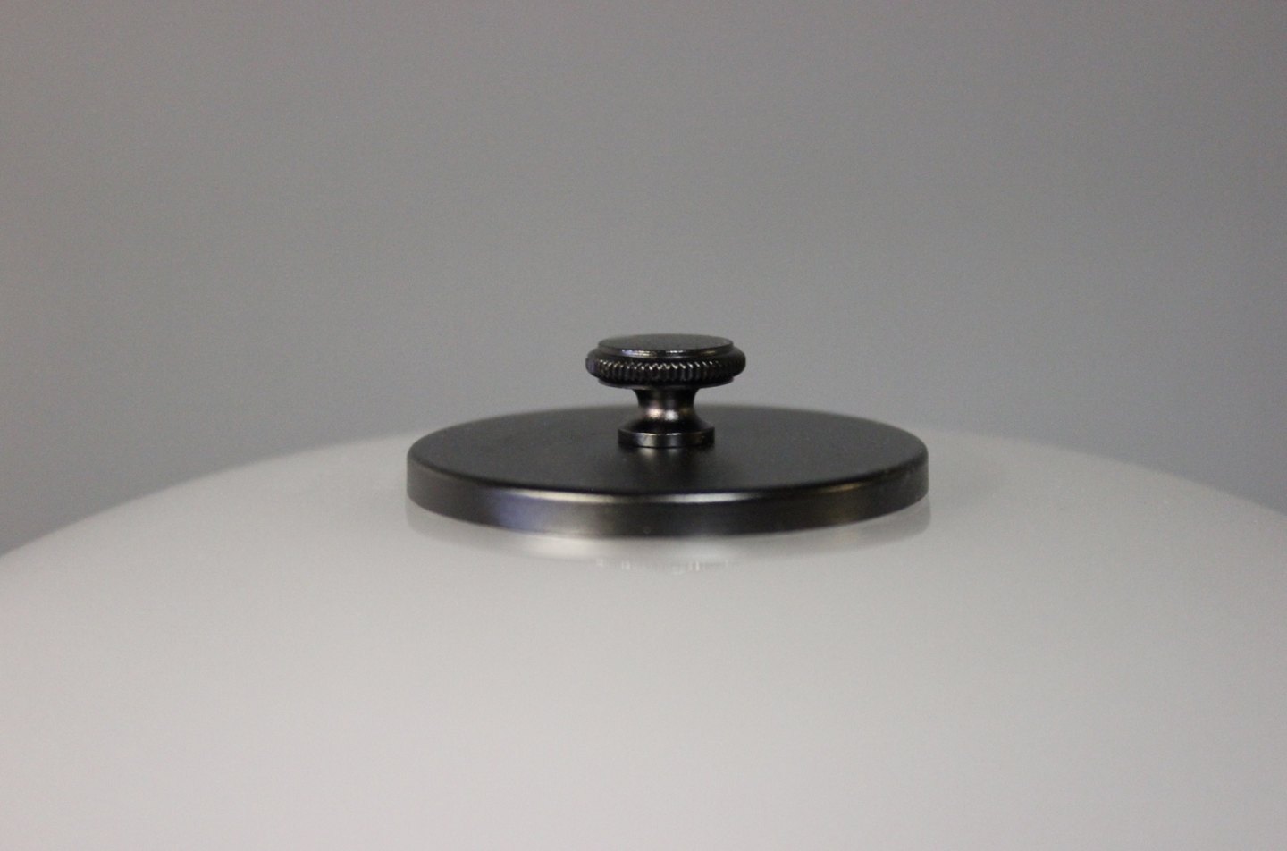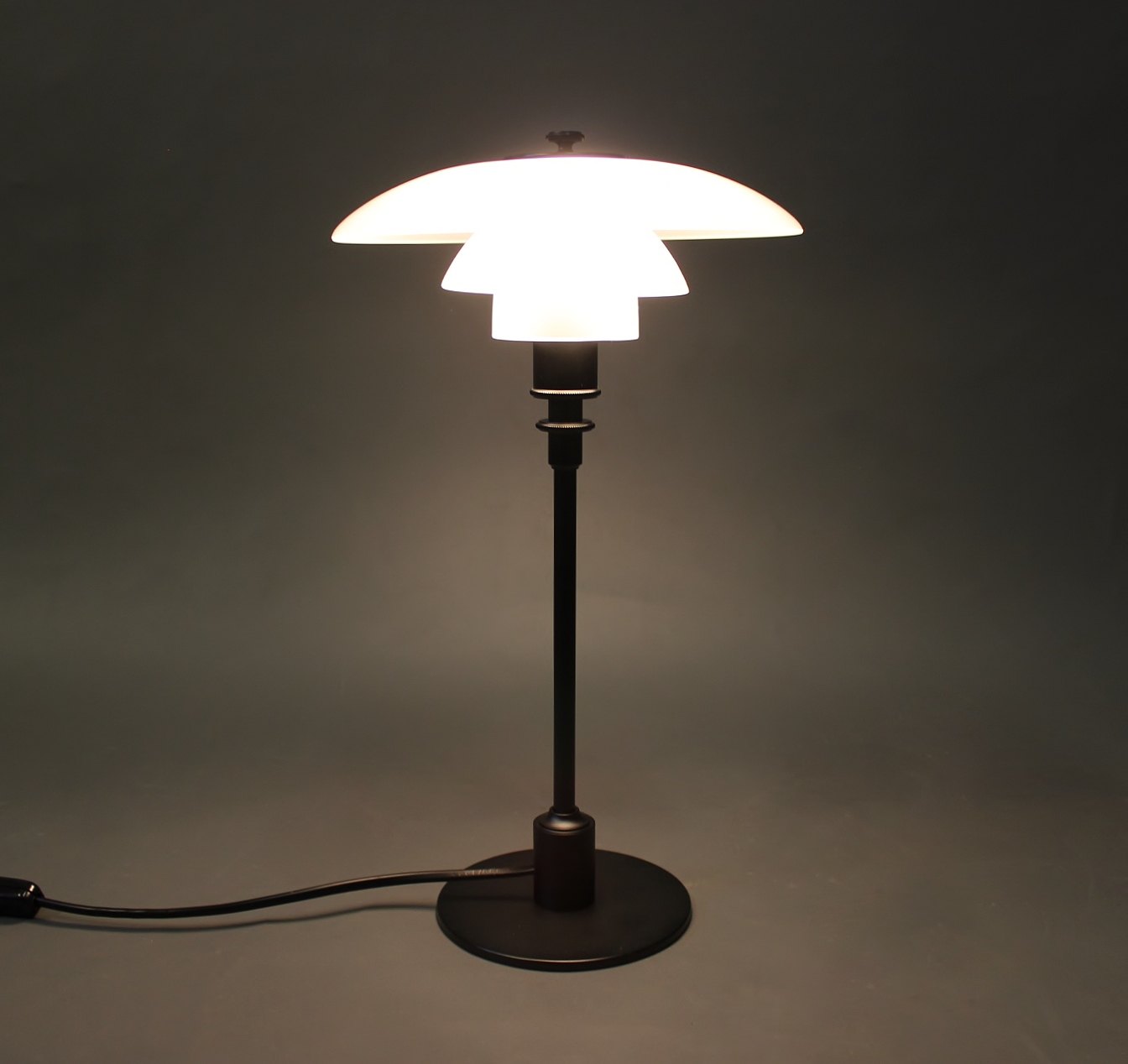 PH 2/1 tablelamp, anniversary model, designed by Poul Henningsen and manufactured by Louis Poulsen. The lamp is with shades of matt opaline glass and black lacquered frame.