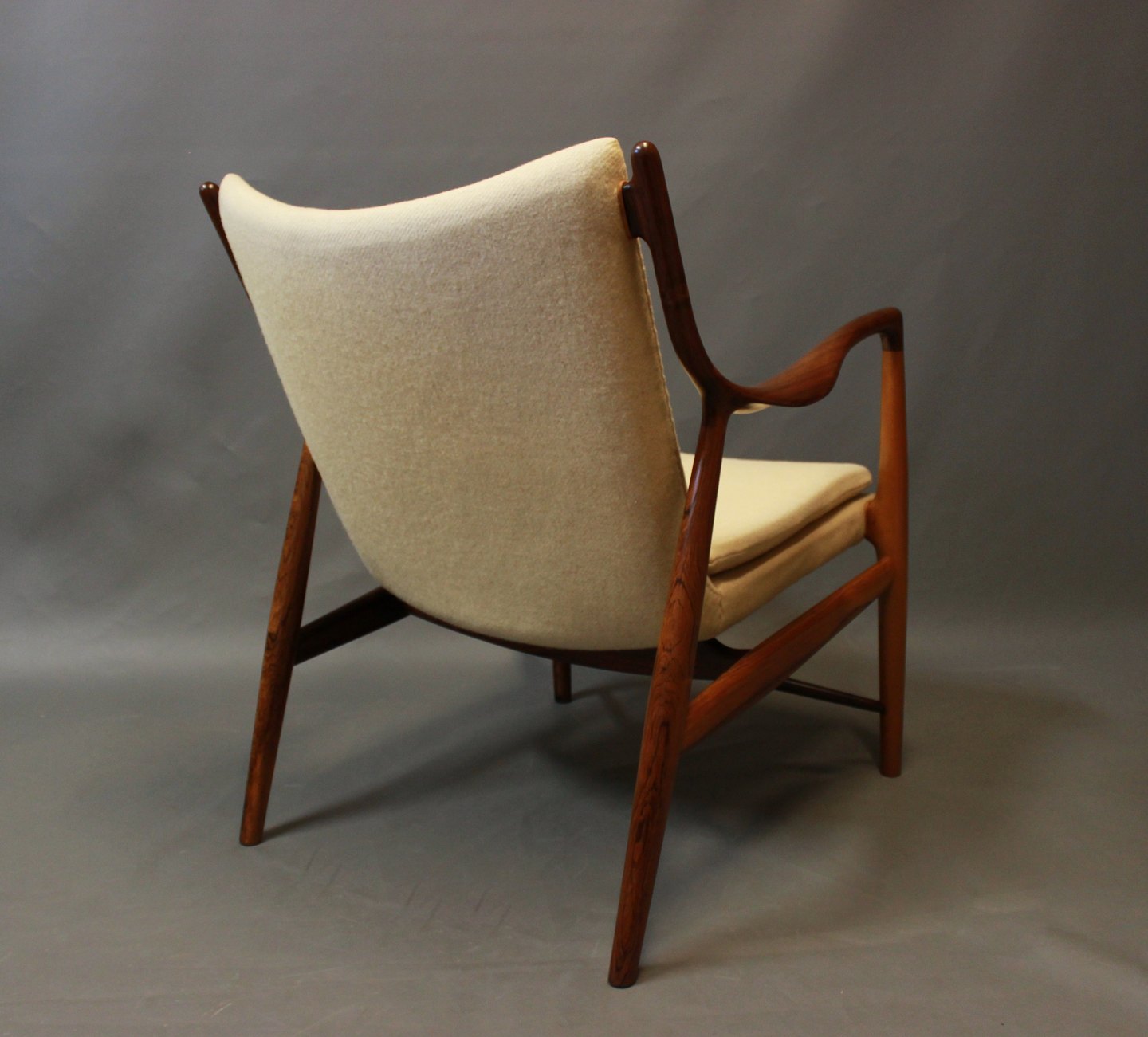 The NV45 recliner, designed by Finn Juhl in 1945 and manufactured by Niels Vodder in the late 1940s, is an excellent representation of Danish modernist furniture design. This chair, made of rosewood and light wool, combines Juhl's unique sense of form and Vodder's sublime craftsmanship.
