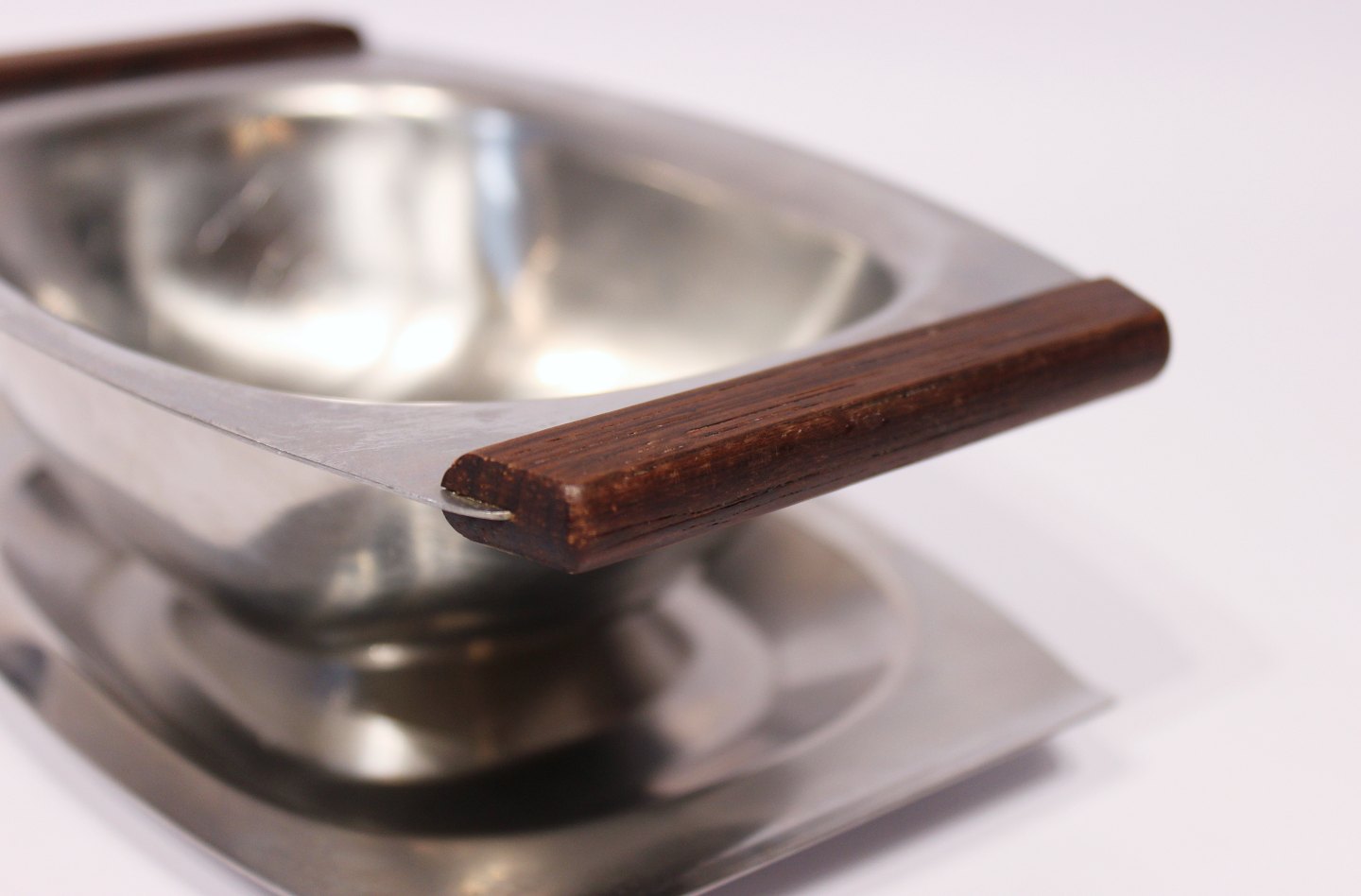 Sovseskål i rustfrit stål og teak håndtag, af Dansk design fra 1960erne.