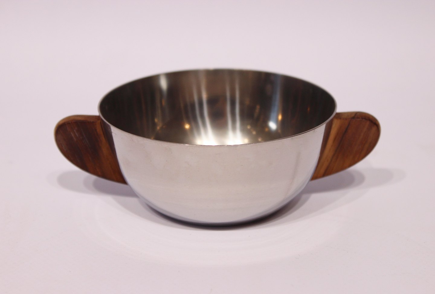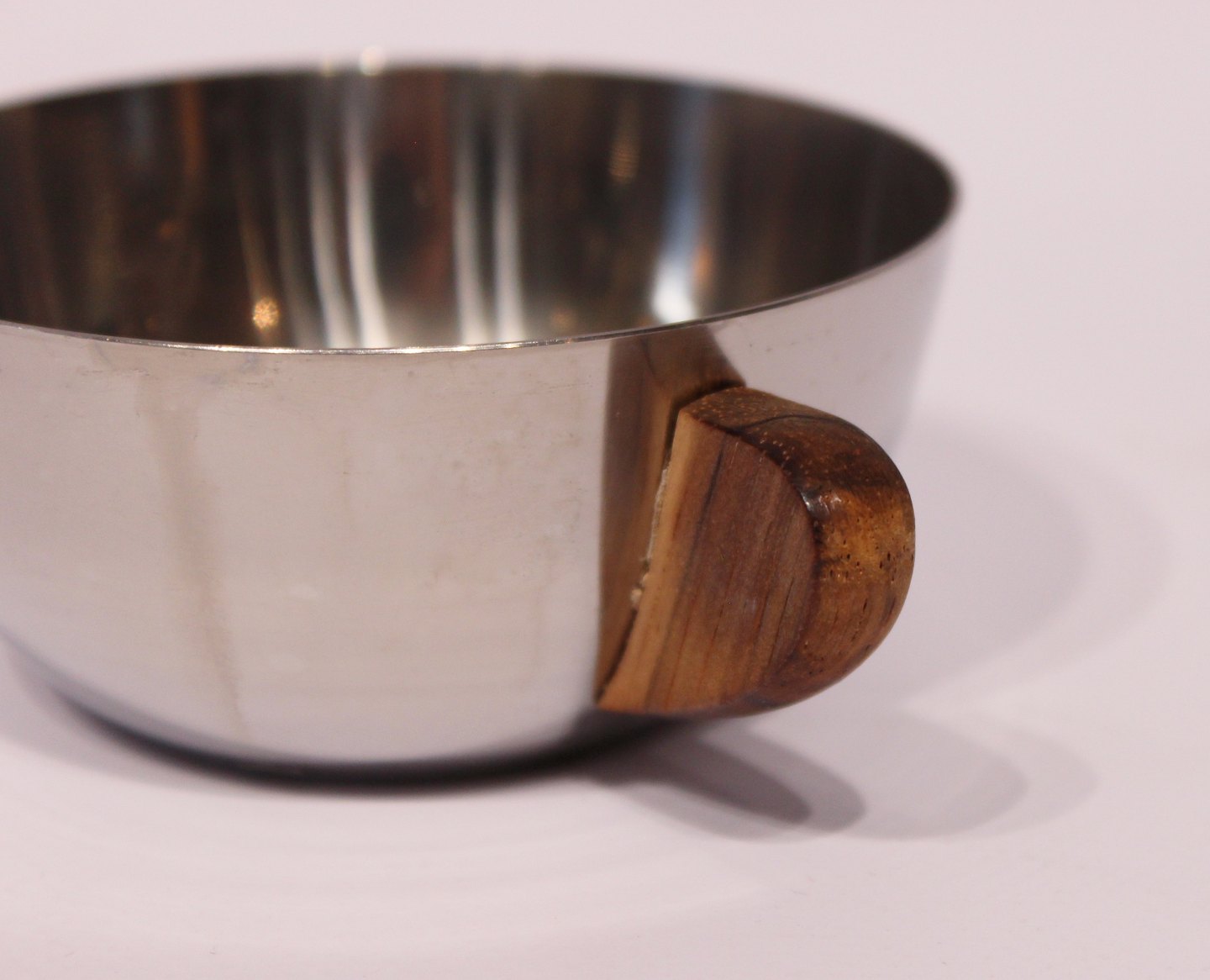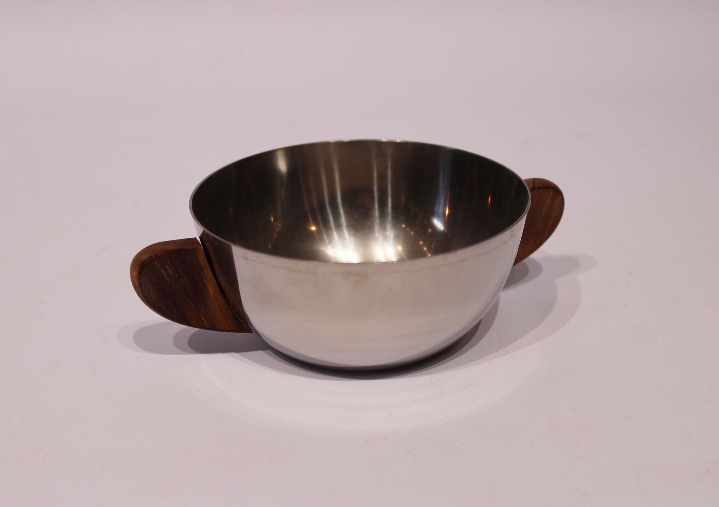 Lille sukkerskål i rustfrit stål med teak håndtag, af dansk design fra 1960erne.