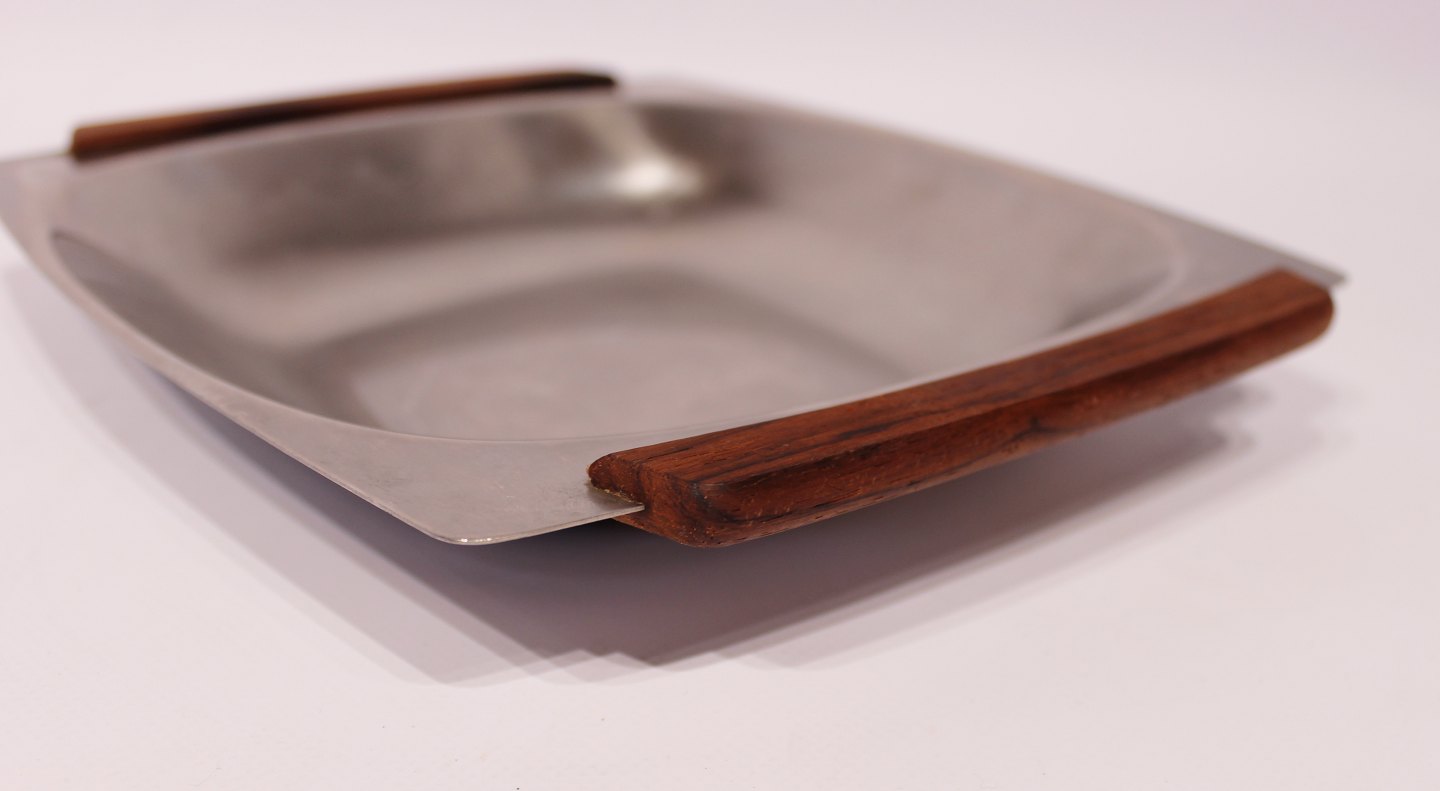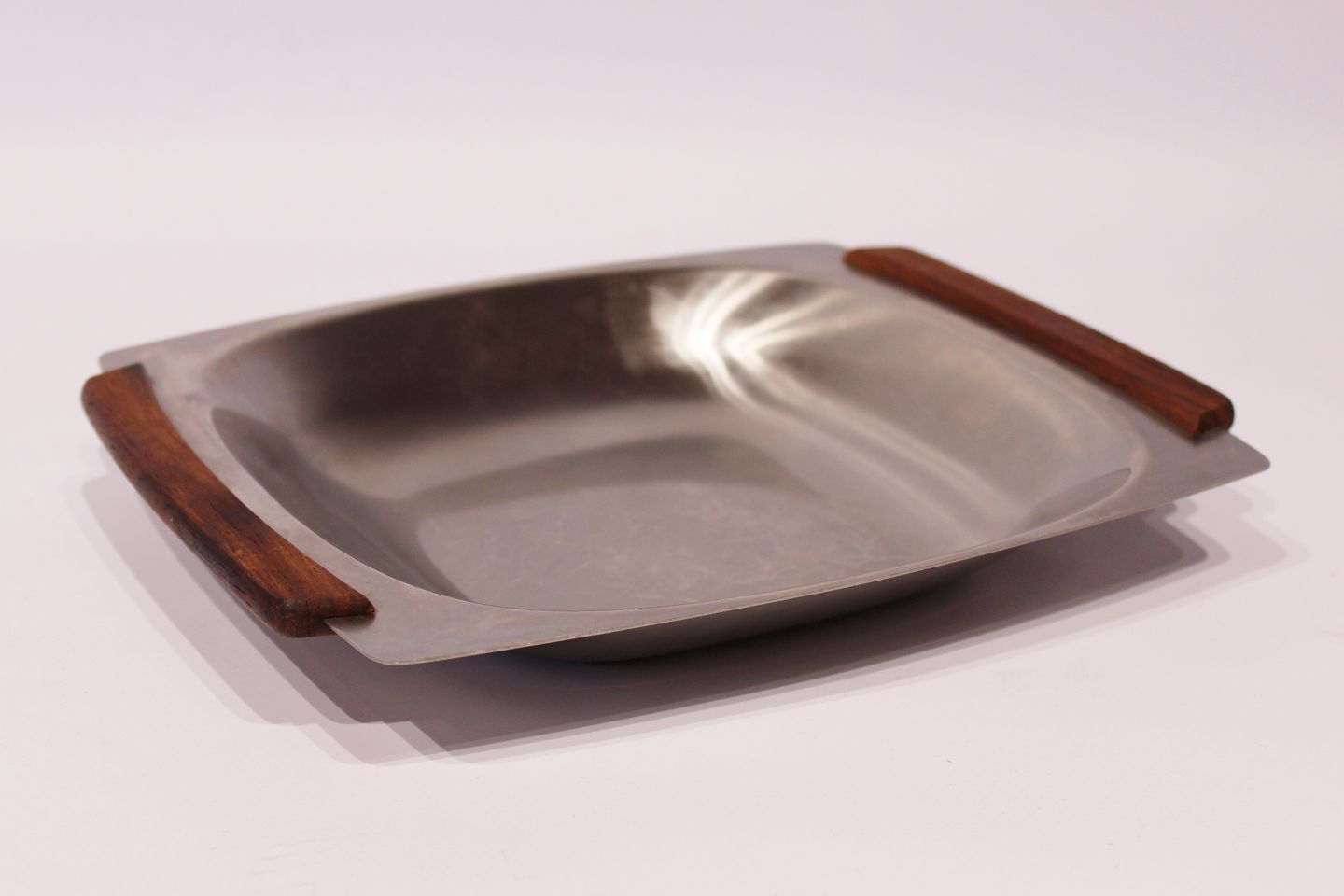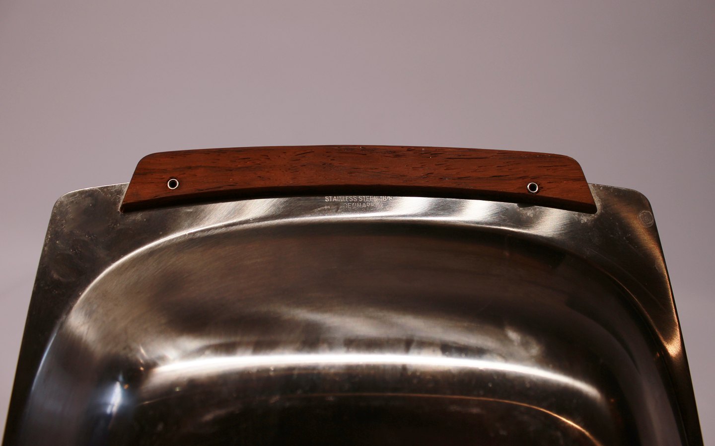 Serving dish in stainless steel with teak handles of danish design from the 1960s.
