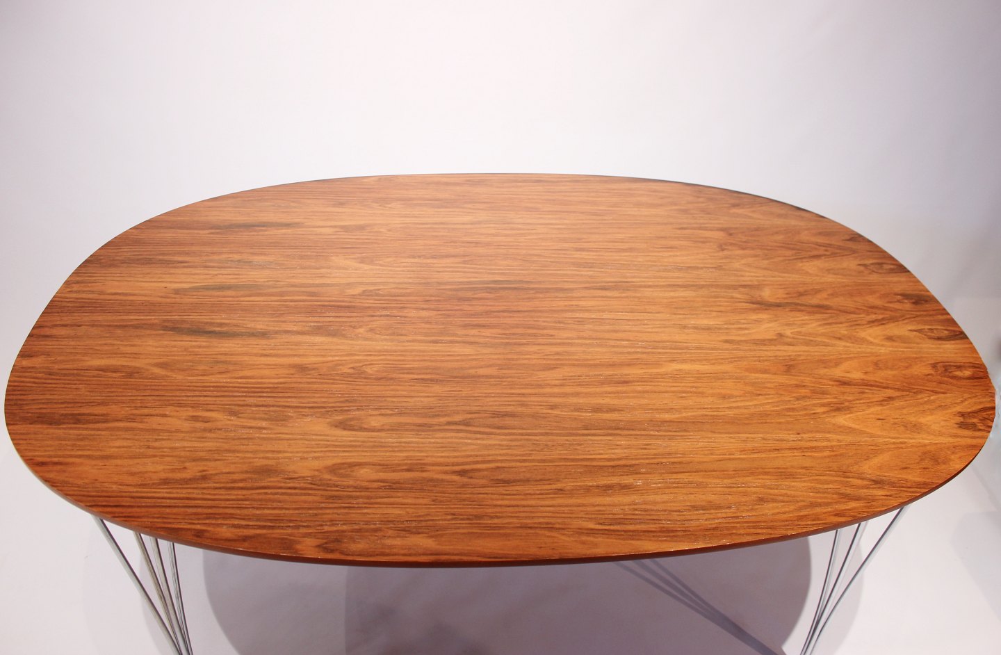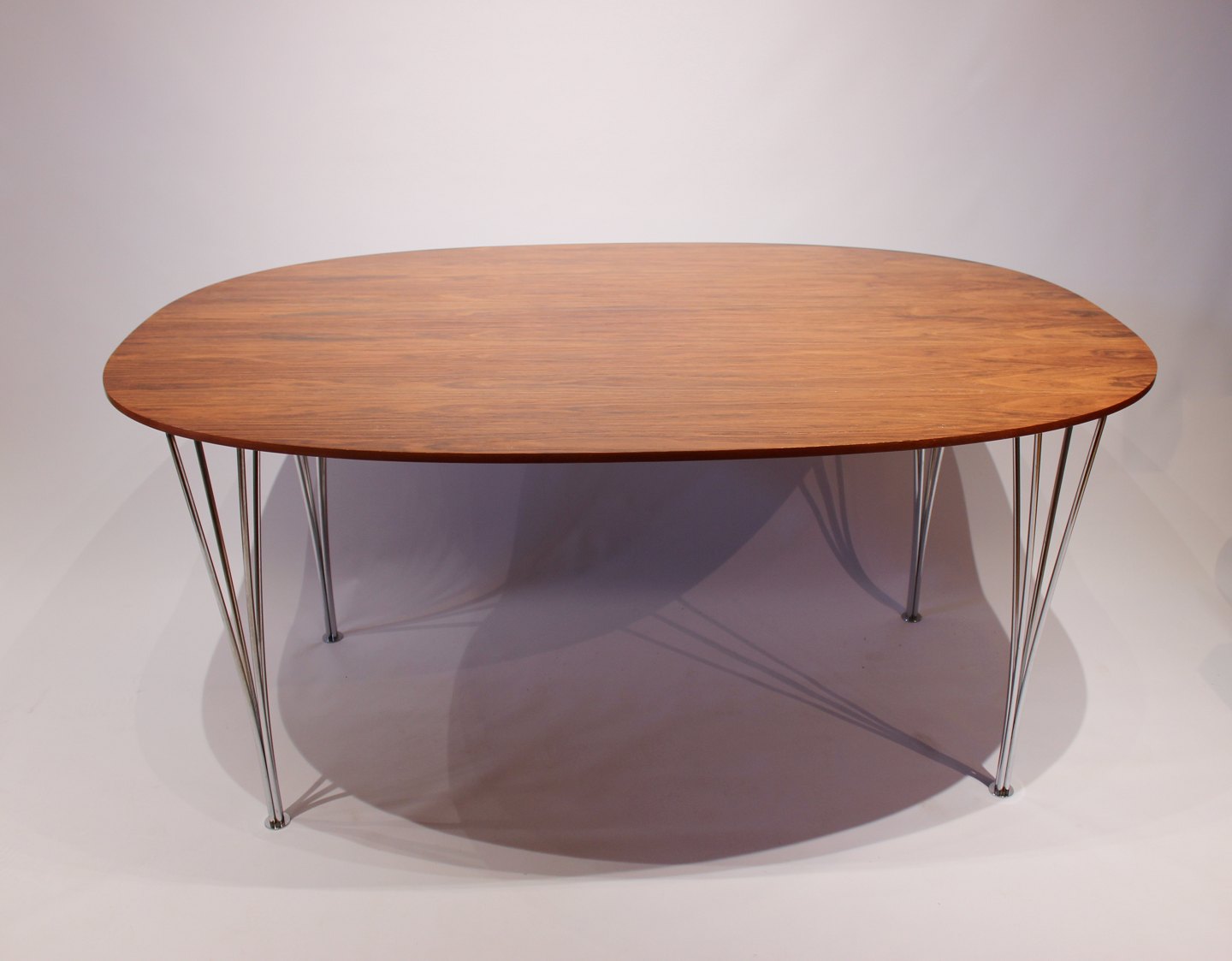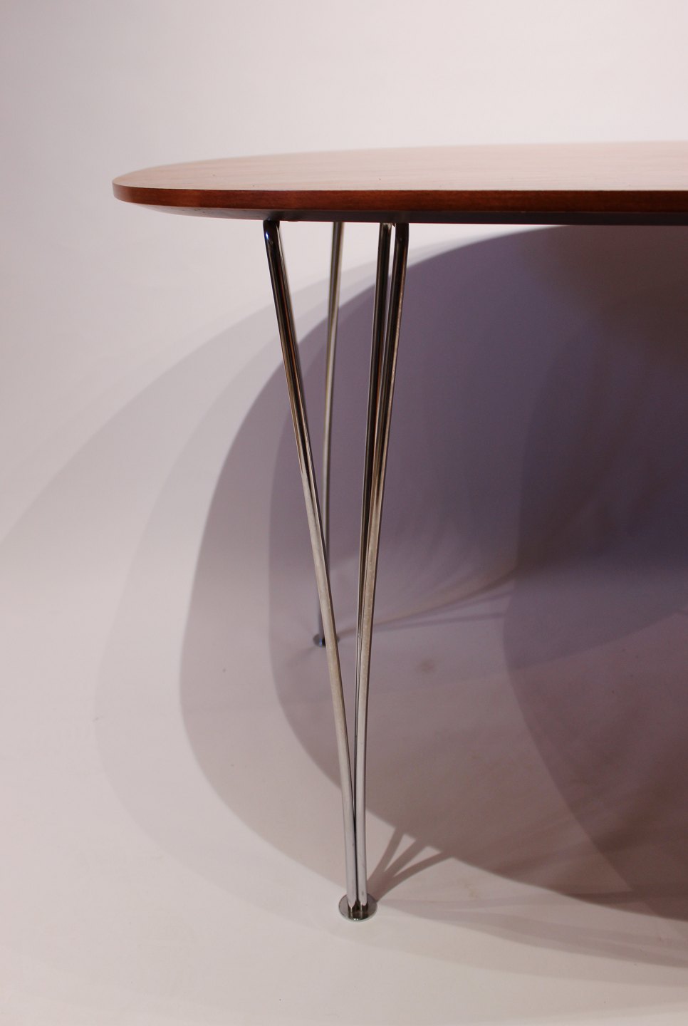 Super Ellipse table in rosewood designed by Piet Hein, Arne Jacobsen and Bruno Mathsson in 1968 and manufactured by Fritz Hansen in 1983. The table is in great vintage condition and with legs of chrome.
