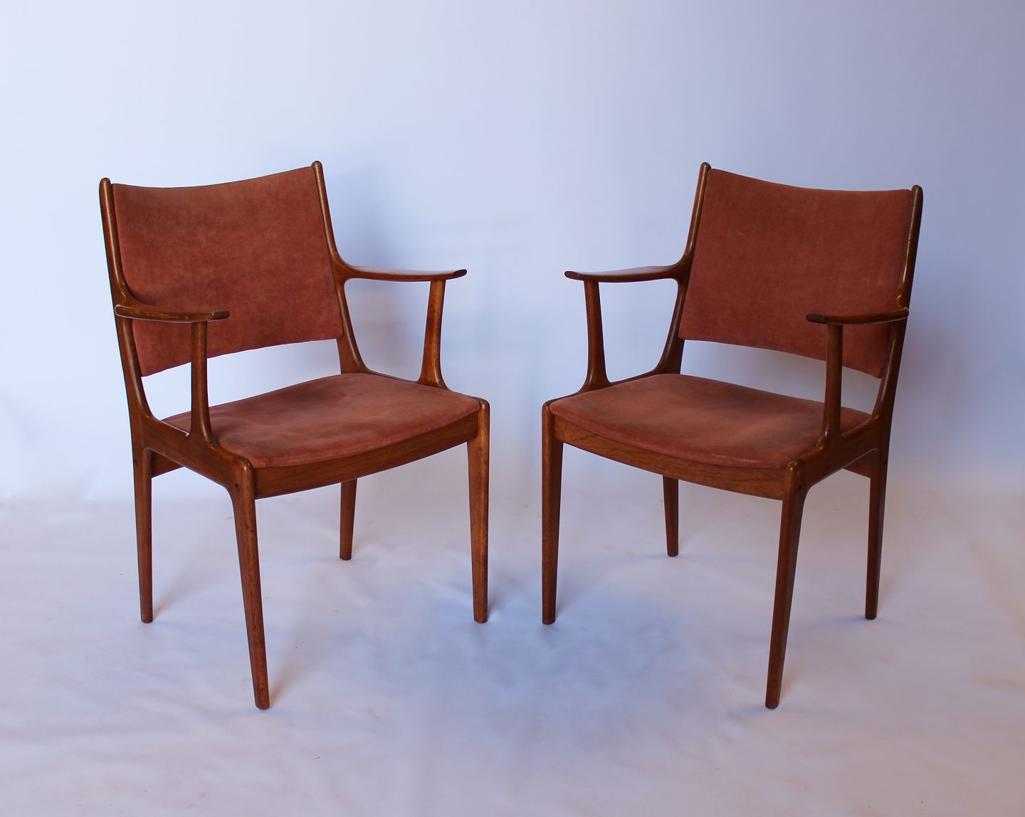 Set of 2 arm chairs in teak and pale pink suede by Johannes Andersen and Ulum Furniture Factory, 1960s.