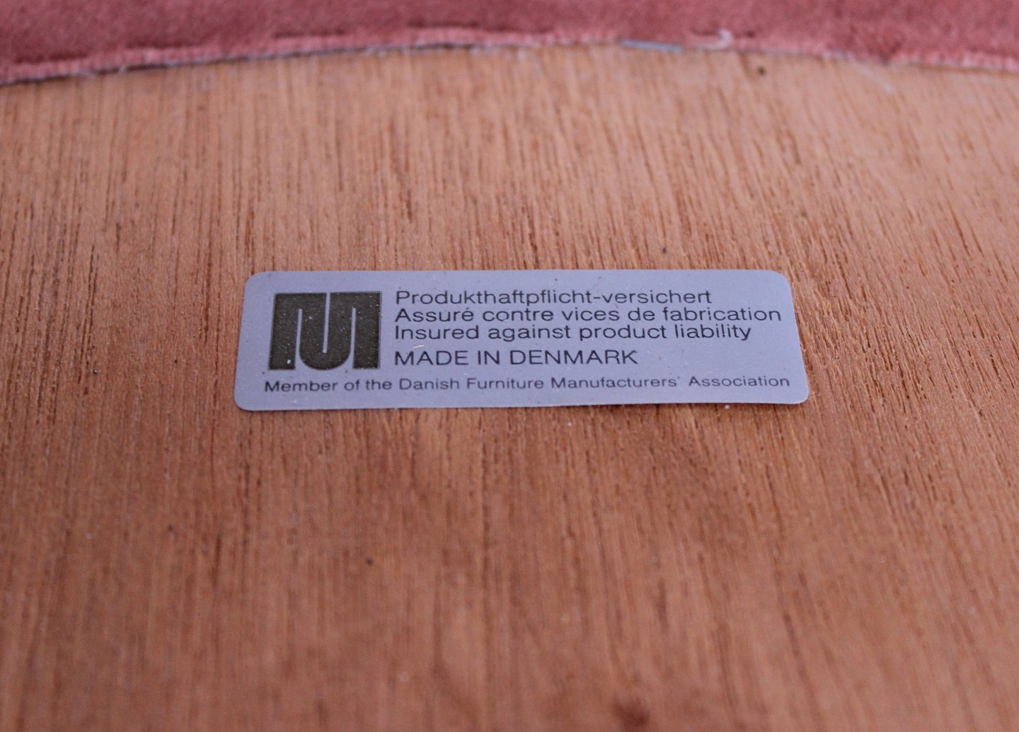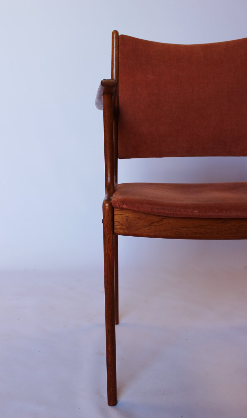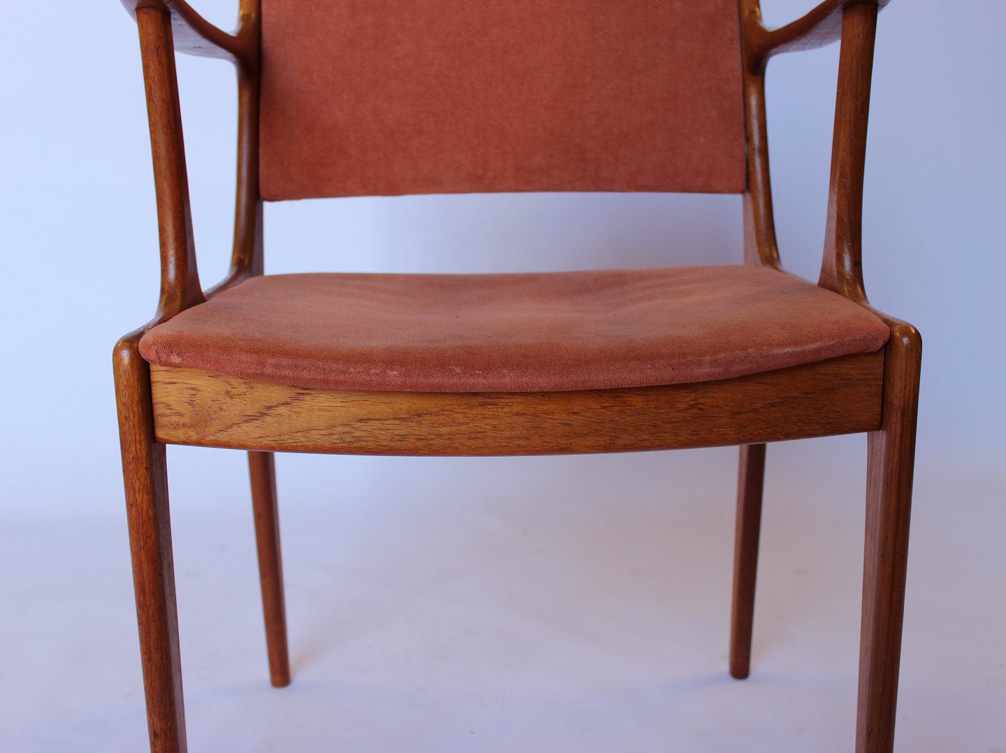 Set of 2 arm chairs in teak and pale pink suede designed by Johannes Andersen and manufactured by Uldum Furniture Factory in the 1960s.