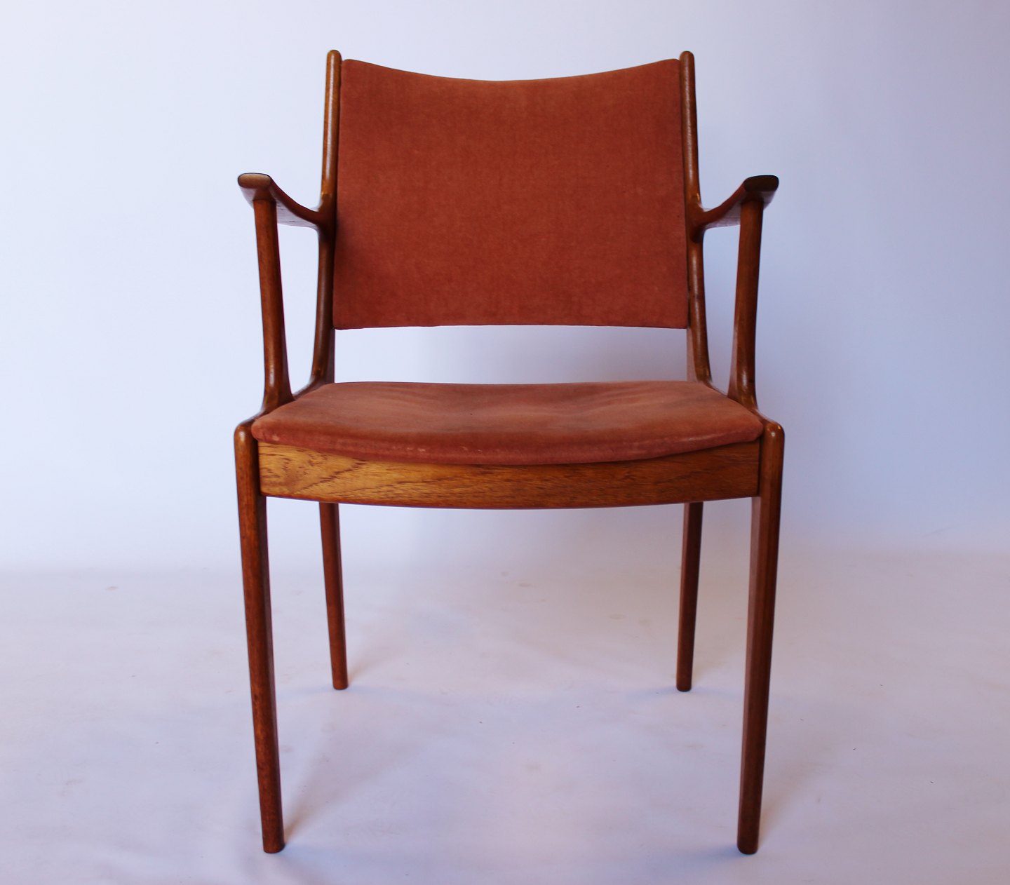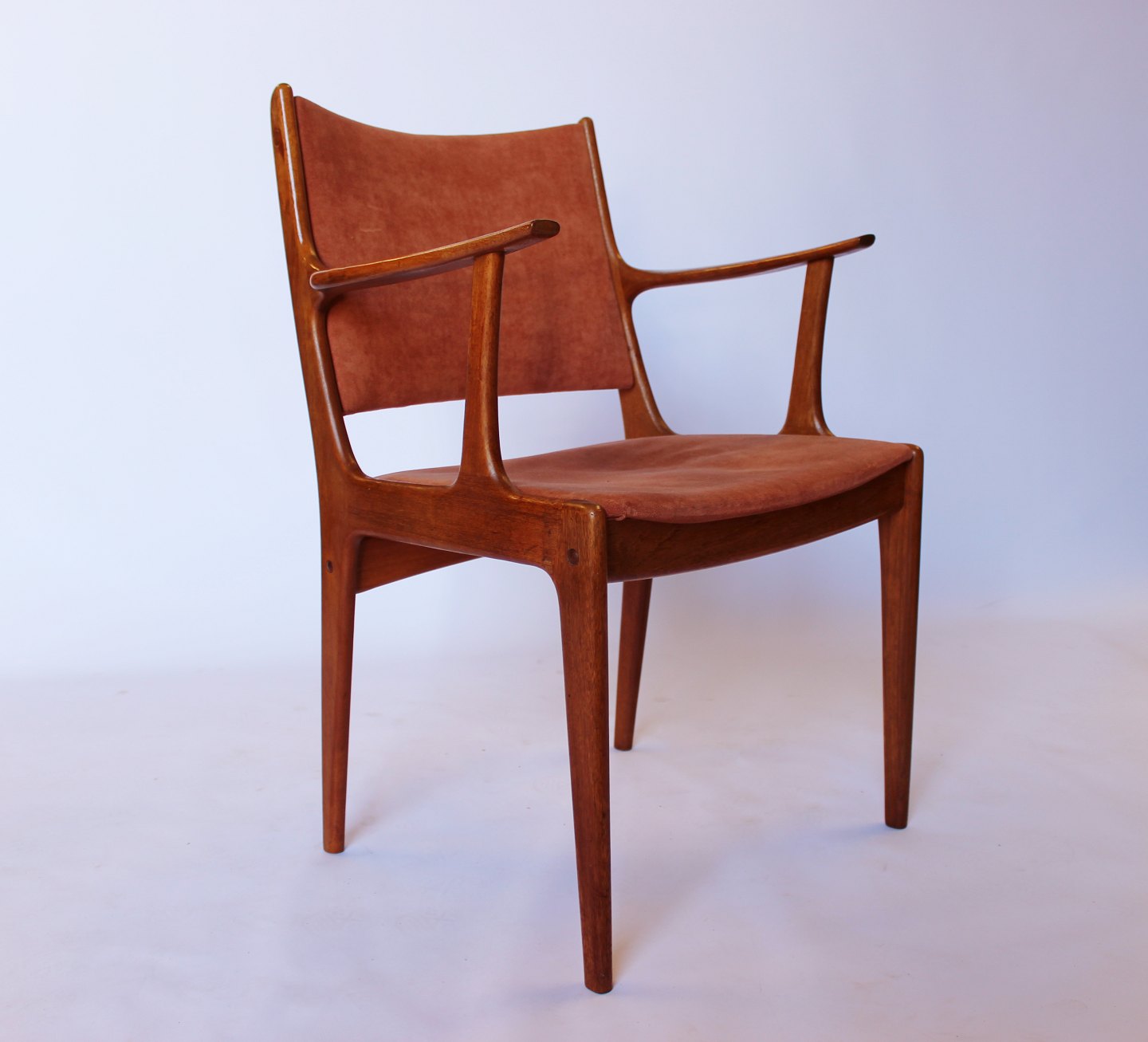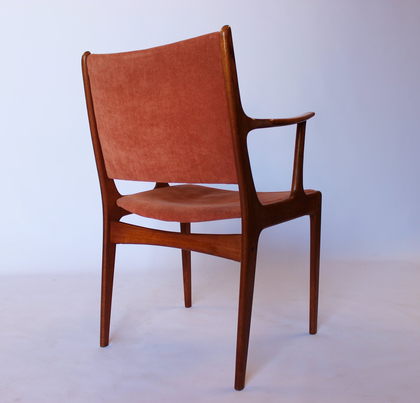 Set of 2 arm chairs in teak and pale pink suede designed by Johannes Andersen and manufactured by Uldum Furniture Factory in the 1960s.