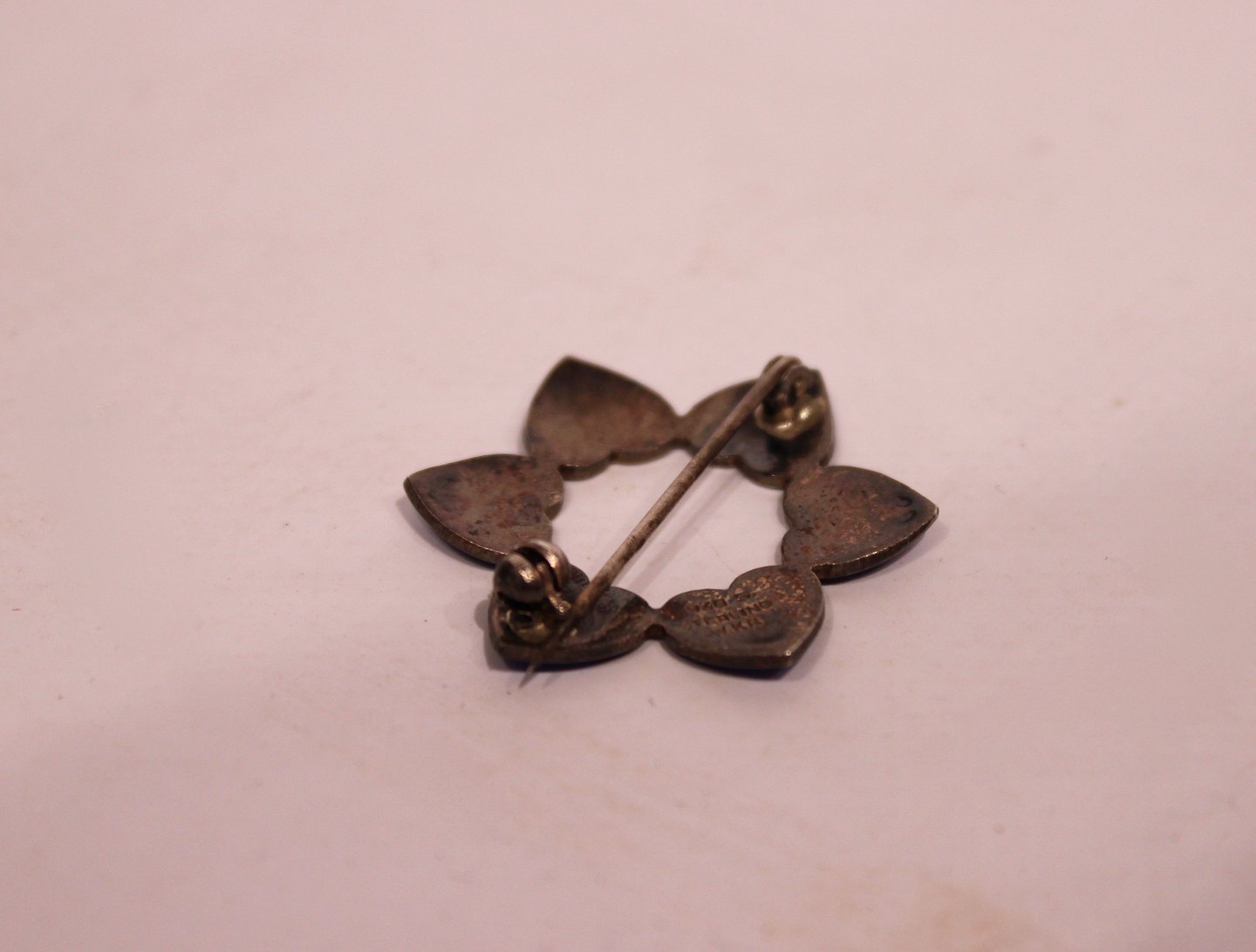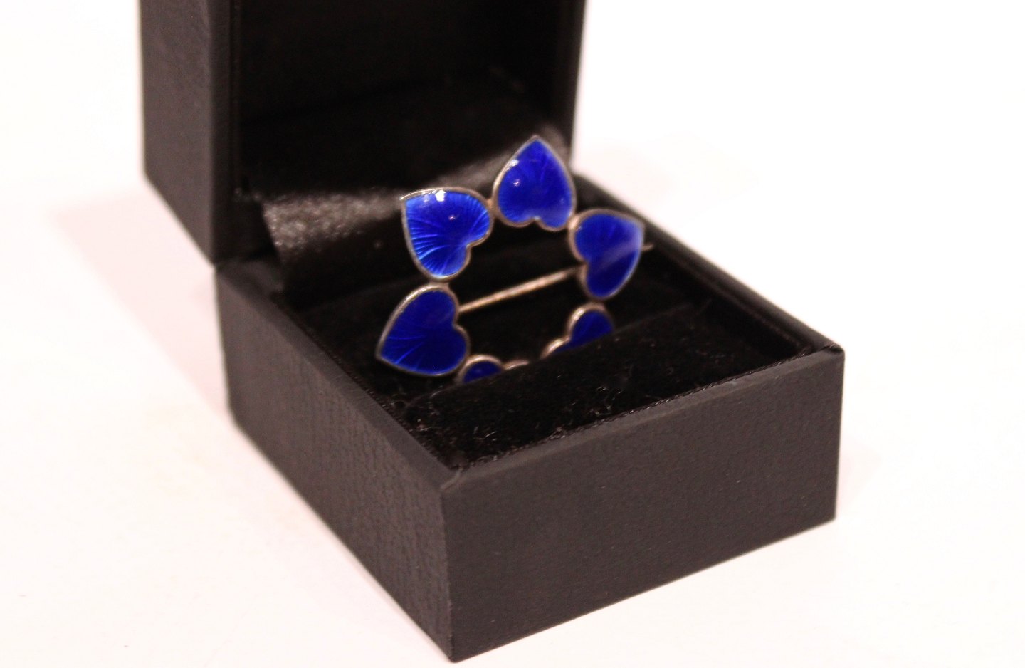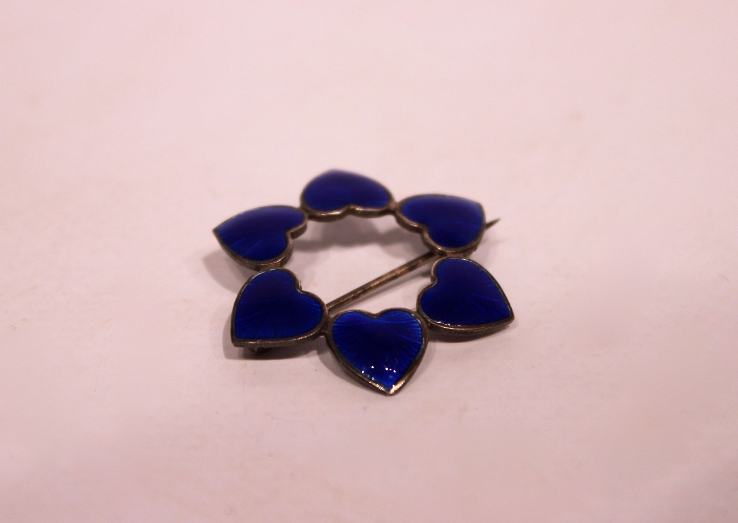 Broche dekoreret med blå hjerter, stemplet WKK af 925 sterling sølv.
