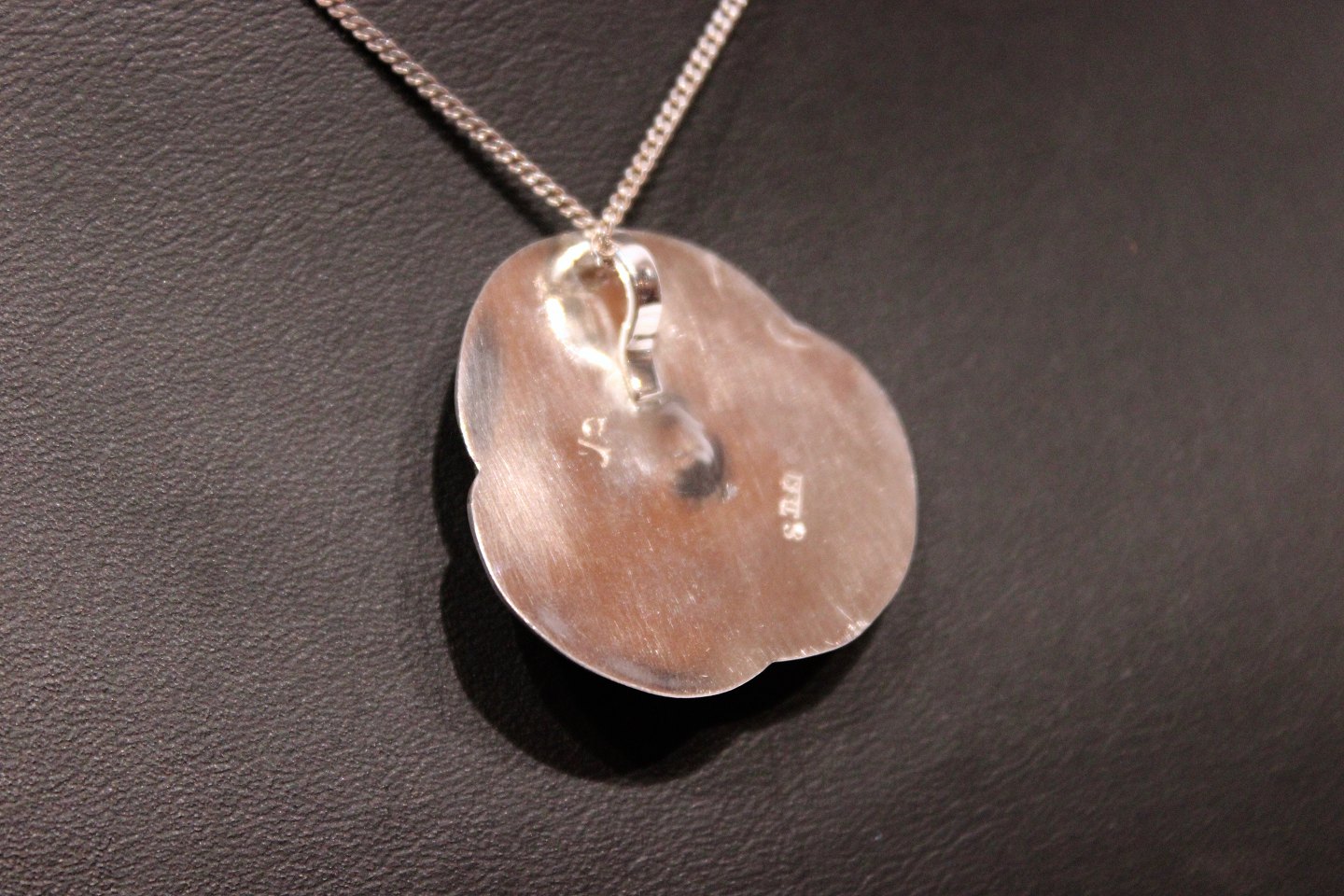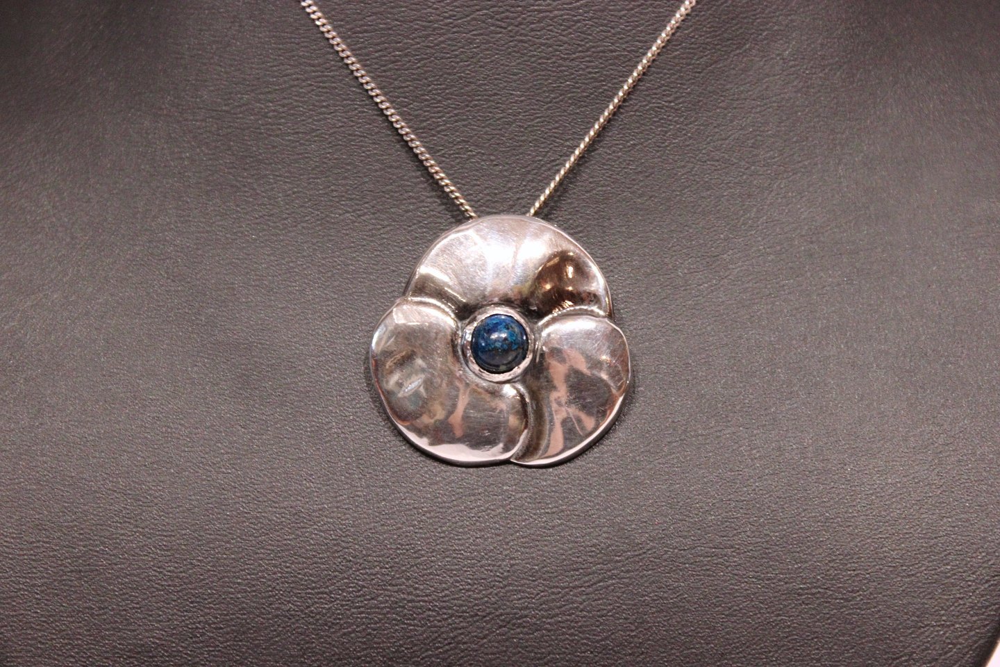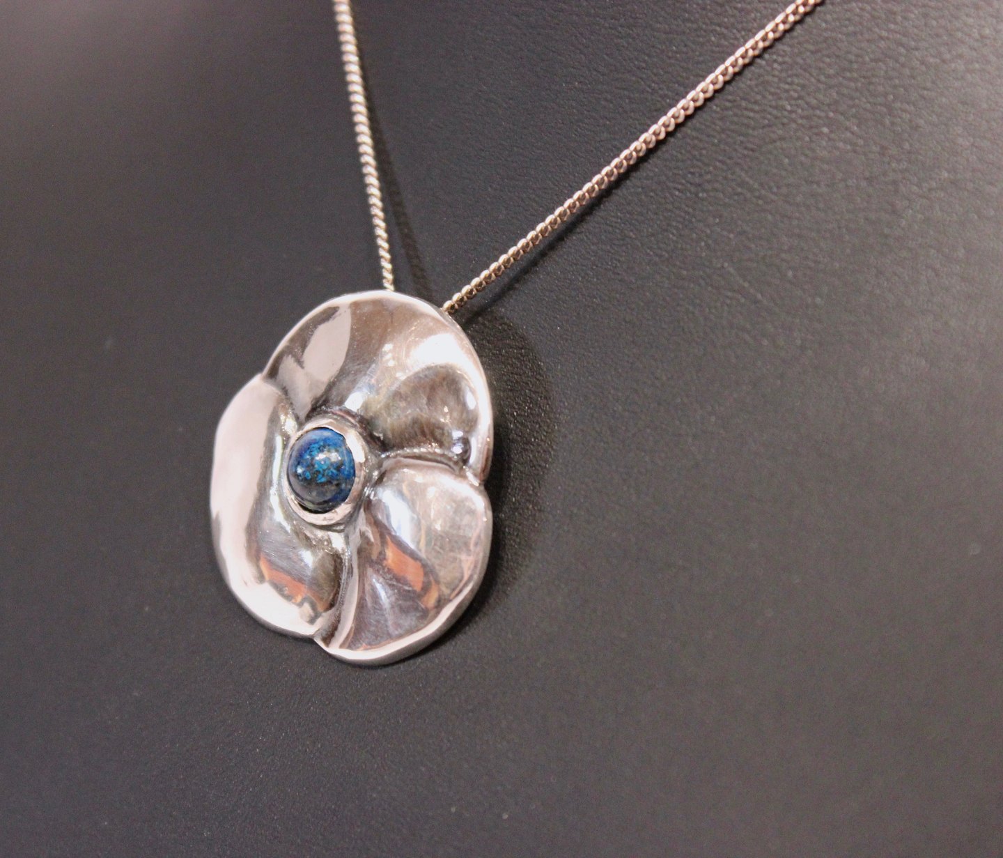 Rundt vedhæng med blå sten af 830 sølv. Lignende kæde kan købes seperat.