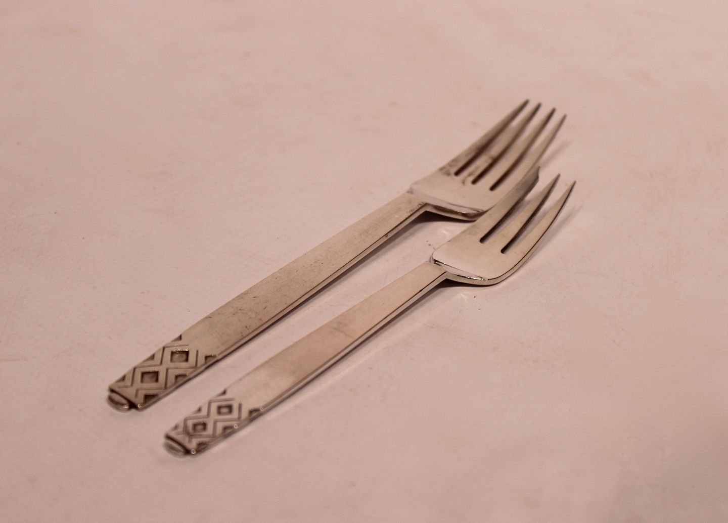 View the price in the text descriptionLunch fork and cake fork in the Rune pattern by Georg Jensen and three-towered silver.
