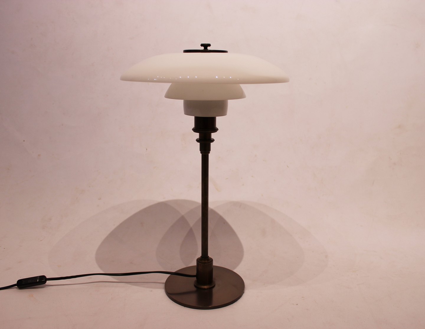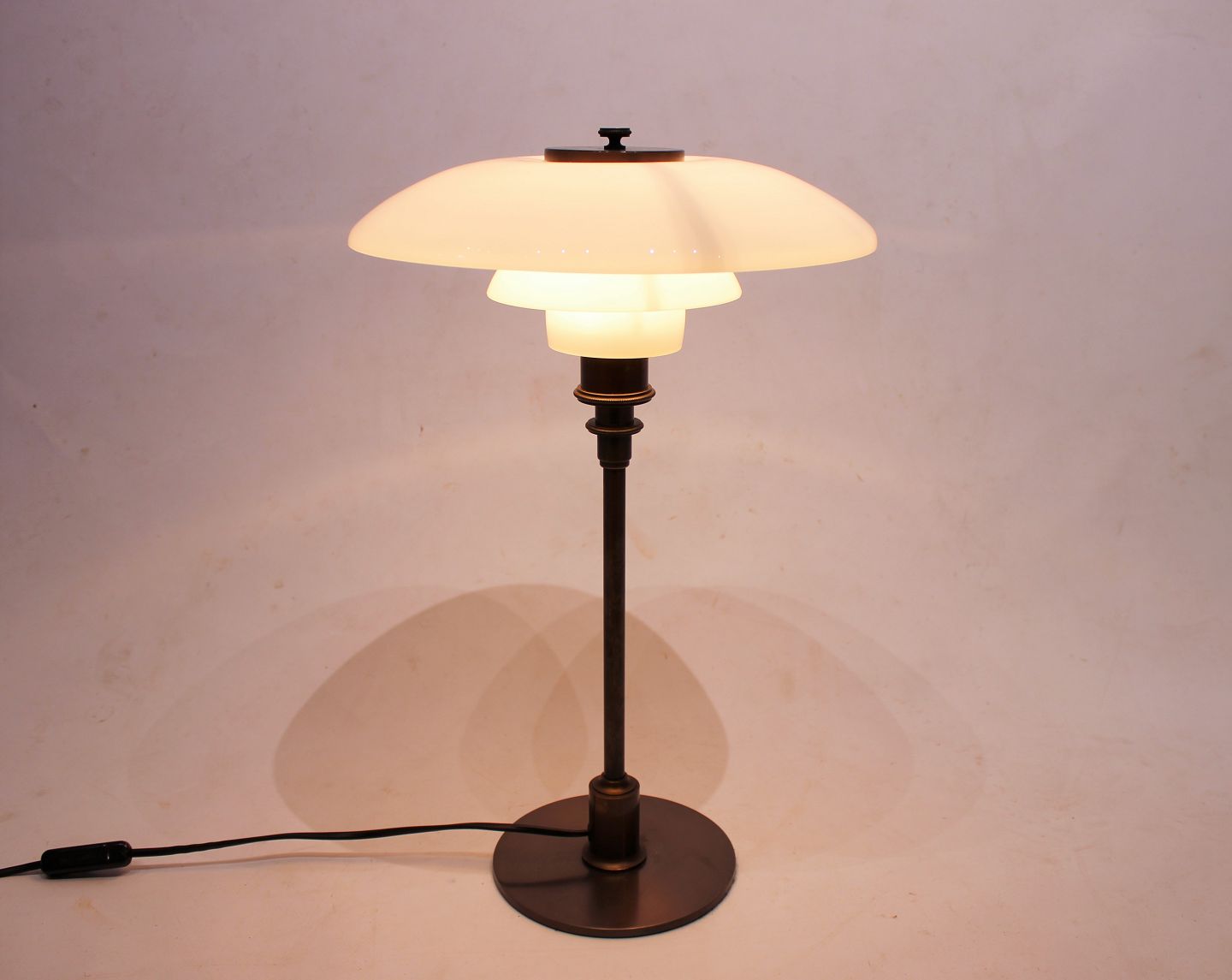 Please contact us for price informationPH 3/2 tablelamp, model Treph, of white opaline glass and frame of burnished brass originally designed by Poul Henningsen and manufactured by Louis Poulsen as an anniversary model in occasion of Poul Henningsen's 100 birthday in 1994.
