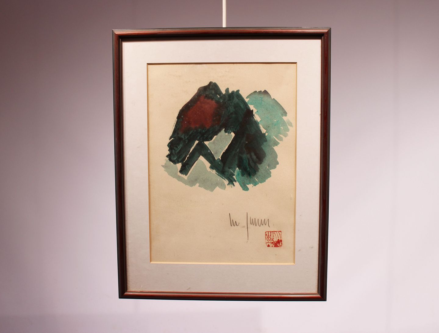 SolgtAkvarel i mørke grønne farver af Hansina Iversen fra Færøerne.