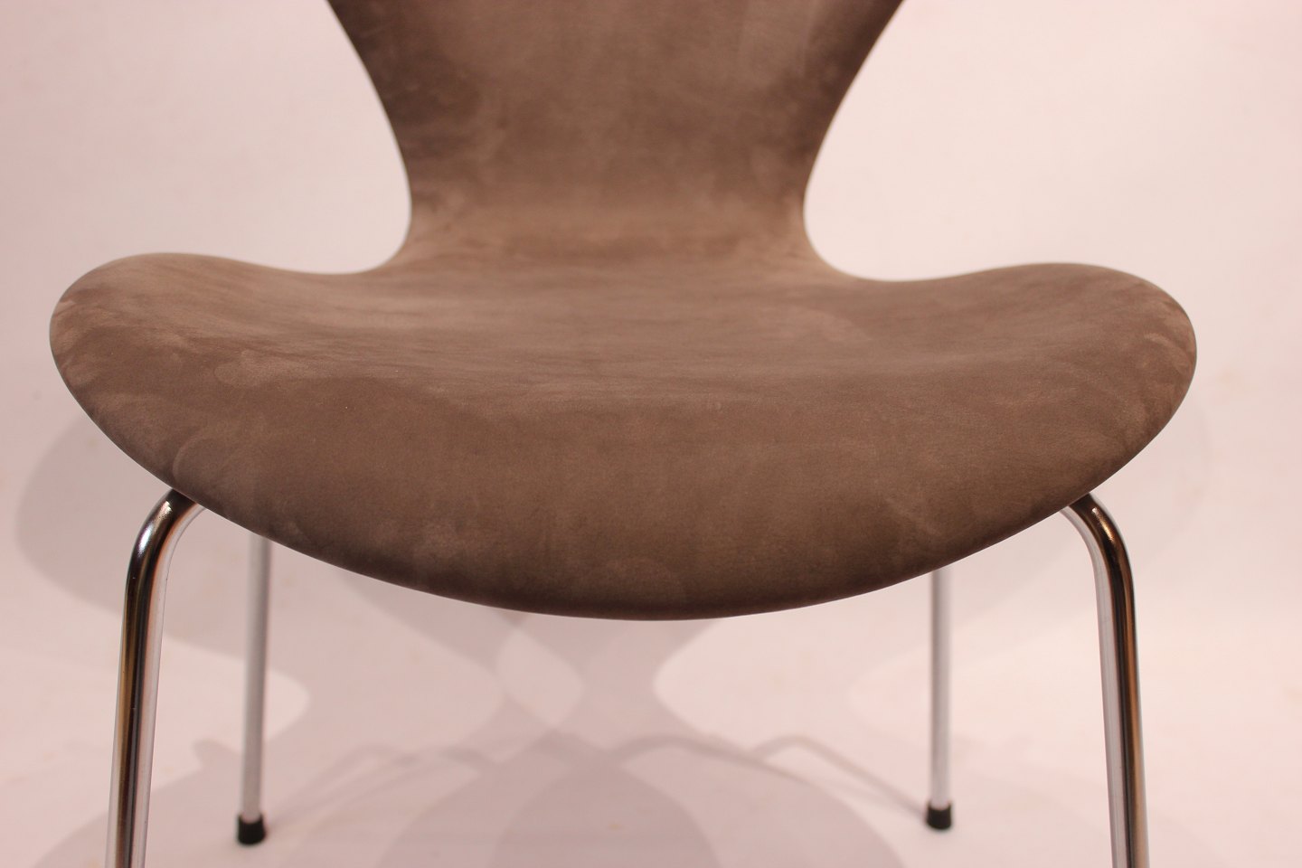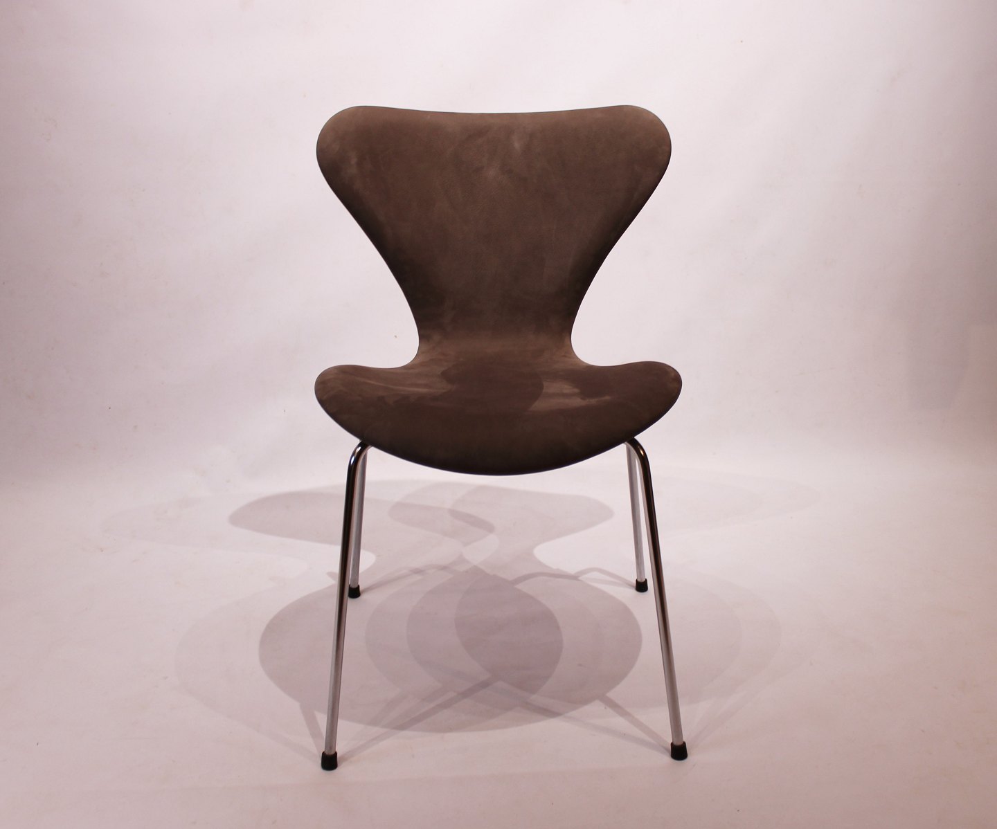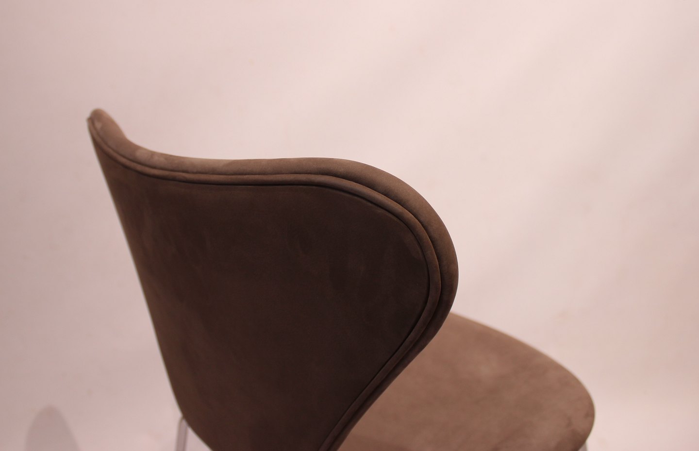 SolgtEt sæt af 6 Syver stole, model 3107, designet af Arne Jacobsen og fremstillet hos Fritz Hansen i 1967. Stolene er originalt polstret i lysebrunt nubuck læder.