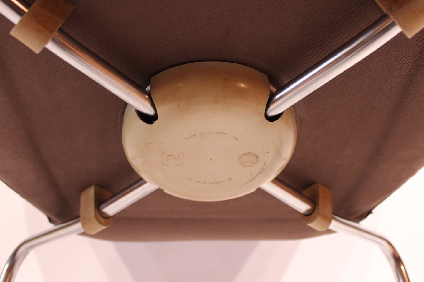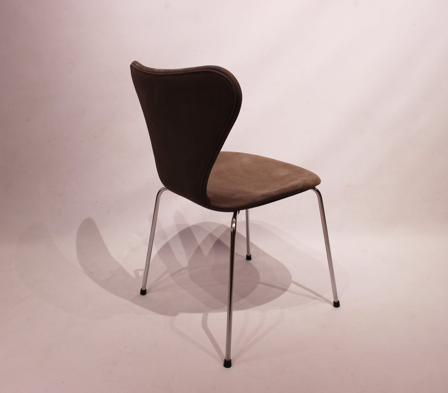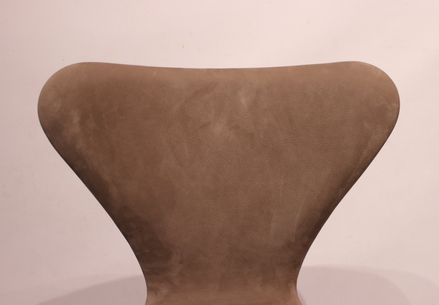 SolgtEt sæt af 6 Syver stole, model 3107, designet af Arne Jacobsen og fremstillet hos Fritz Hansen i 1967. Stolene er originalt polstret i lysebrunt nubuck læder.