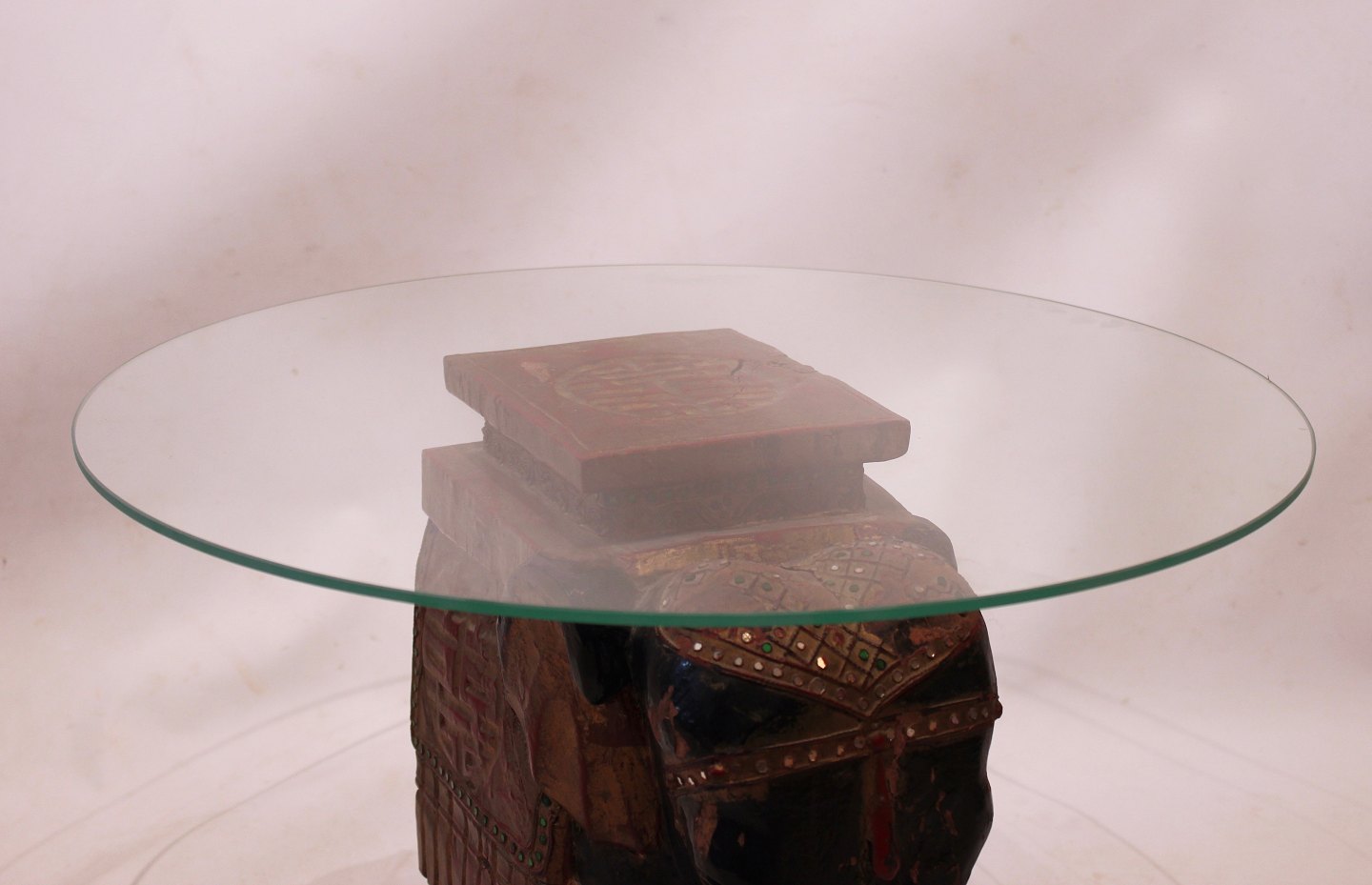 A pair of sidetables with glass plate and bottom of chinese elephants of orignal painted wood and patina from around the 1880s. The tables are in great antique condition.