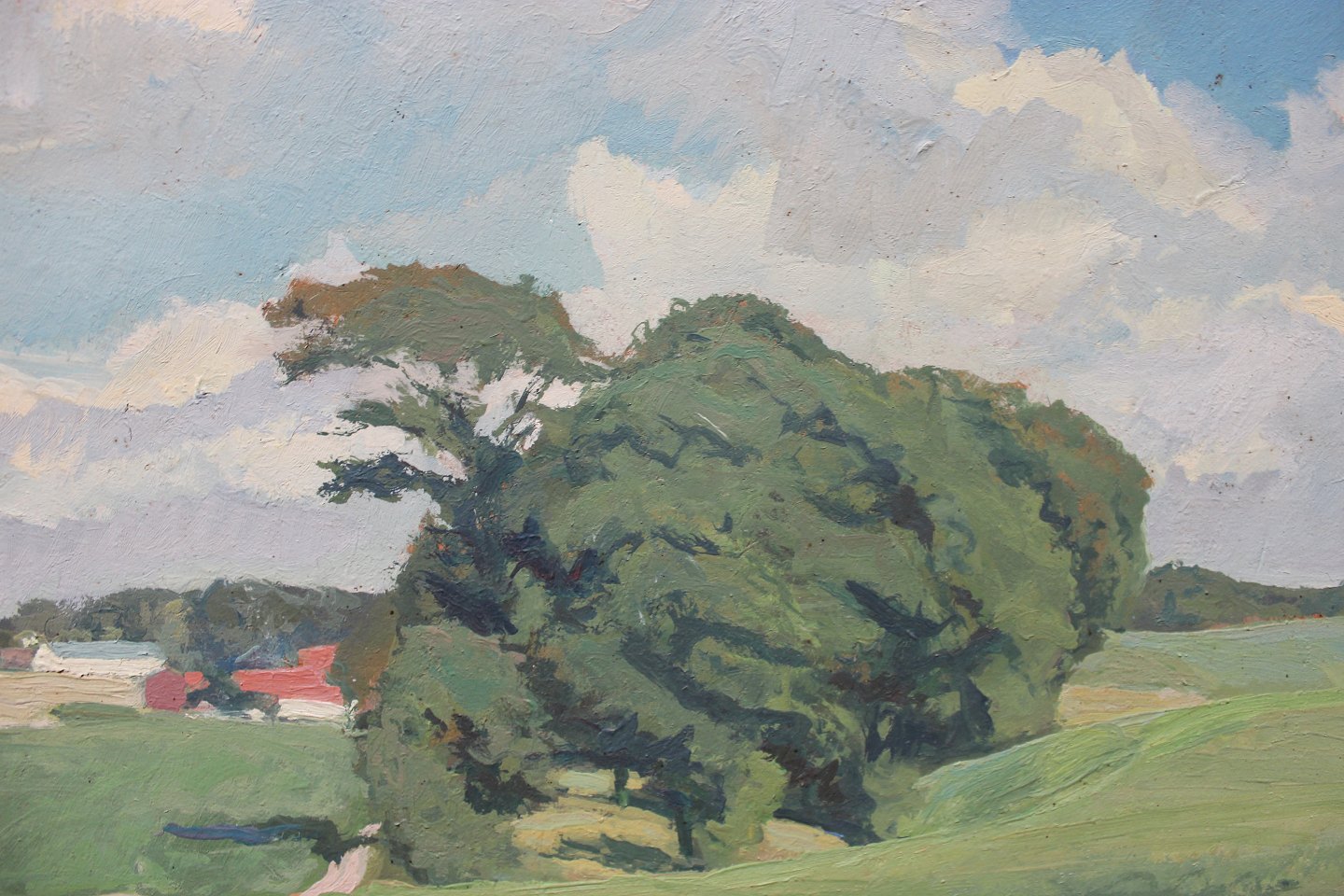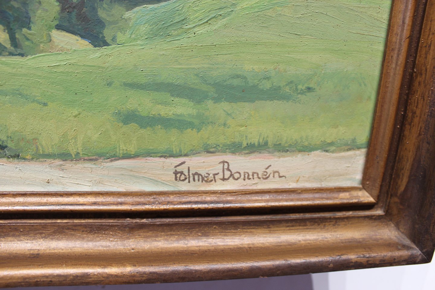 Oliemaleri med land motiv i lyse farver af den danske kunster Folmer Bonnén.