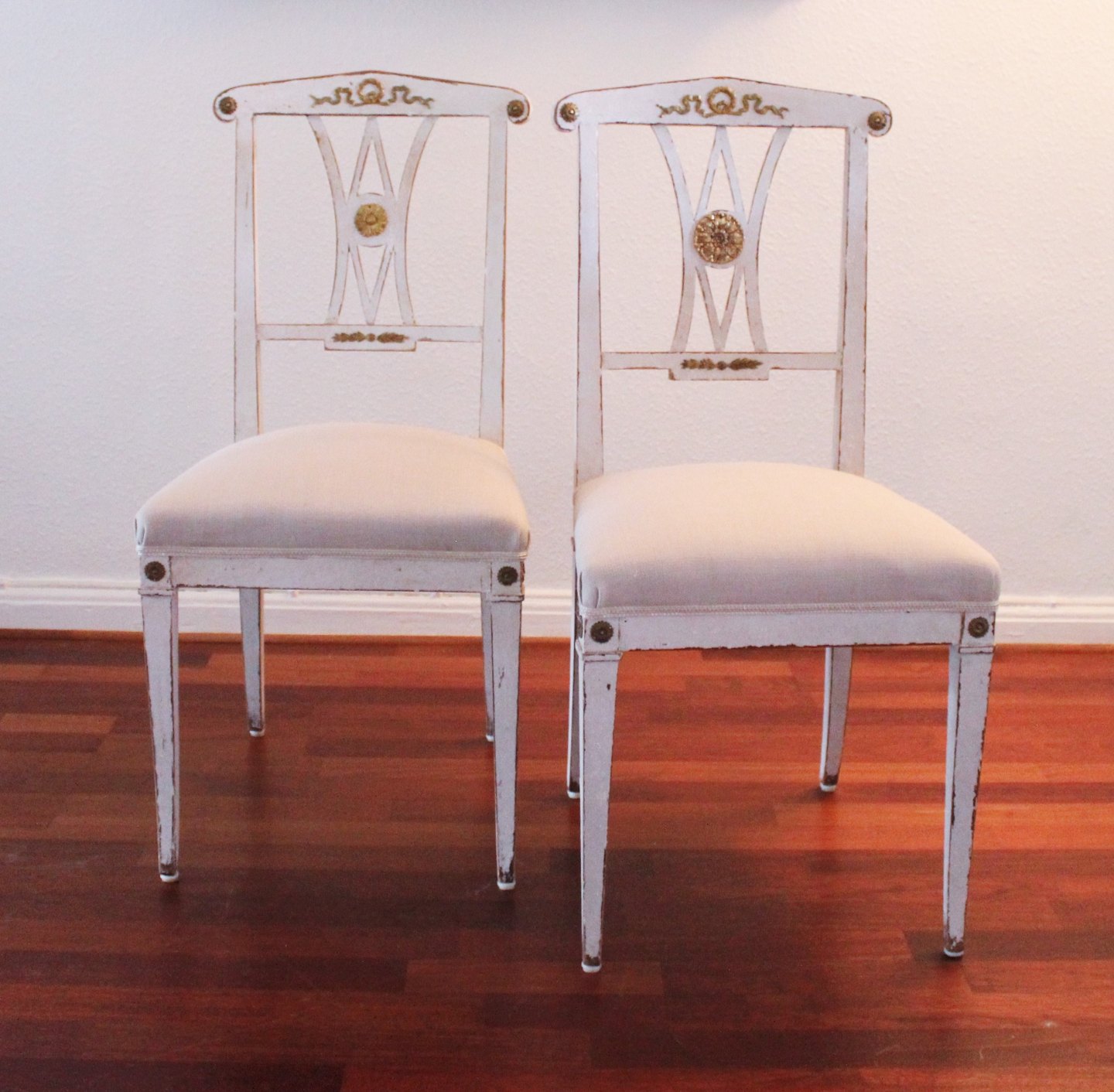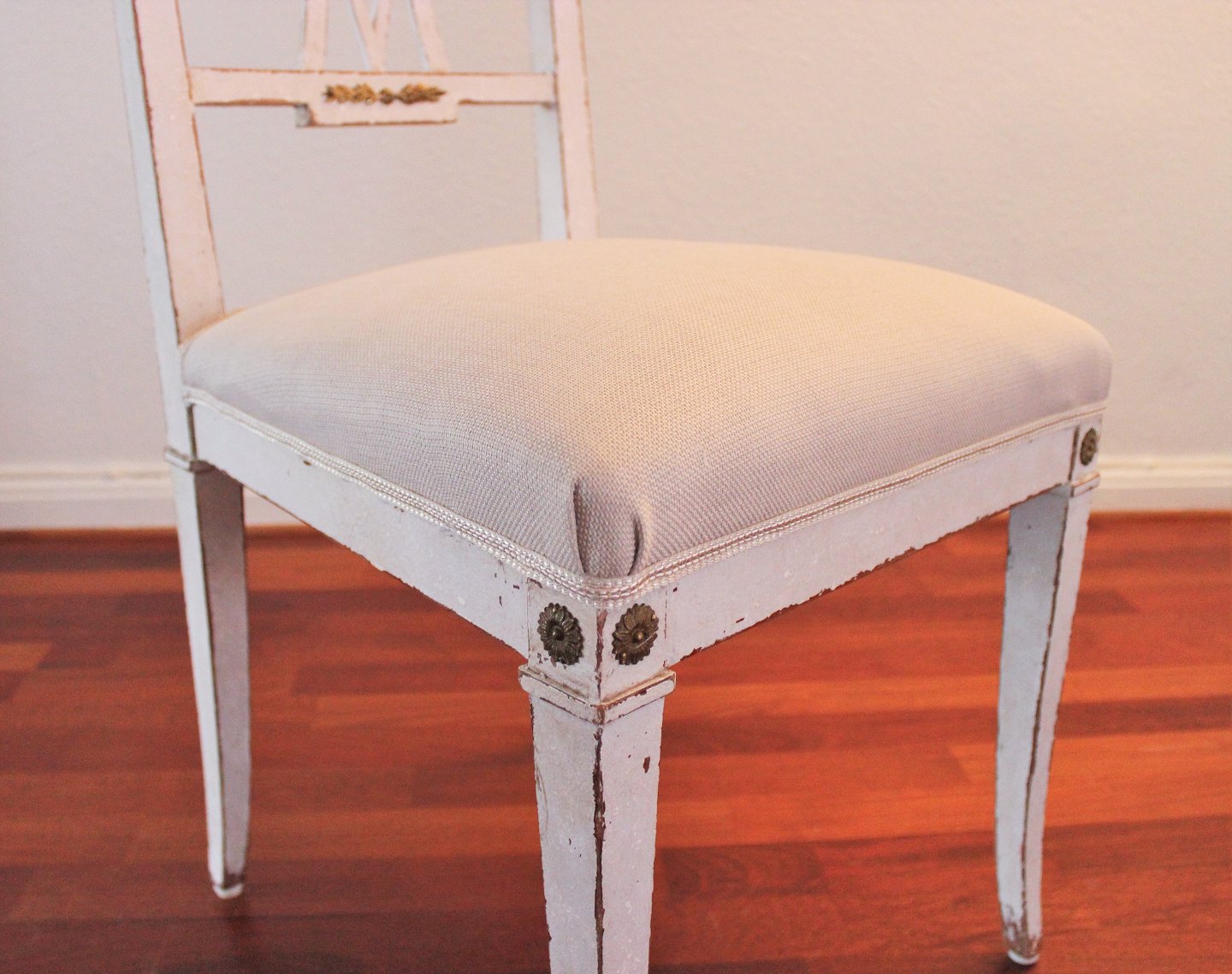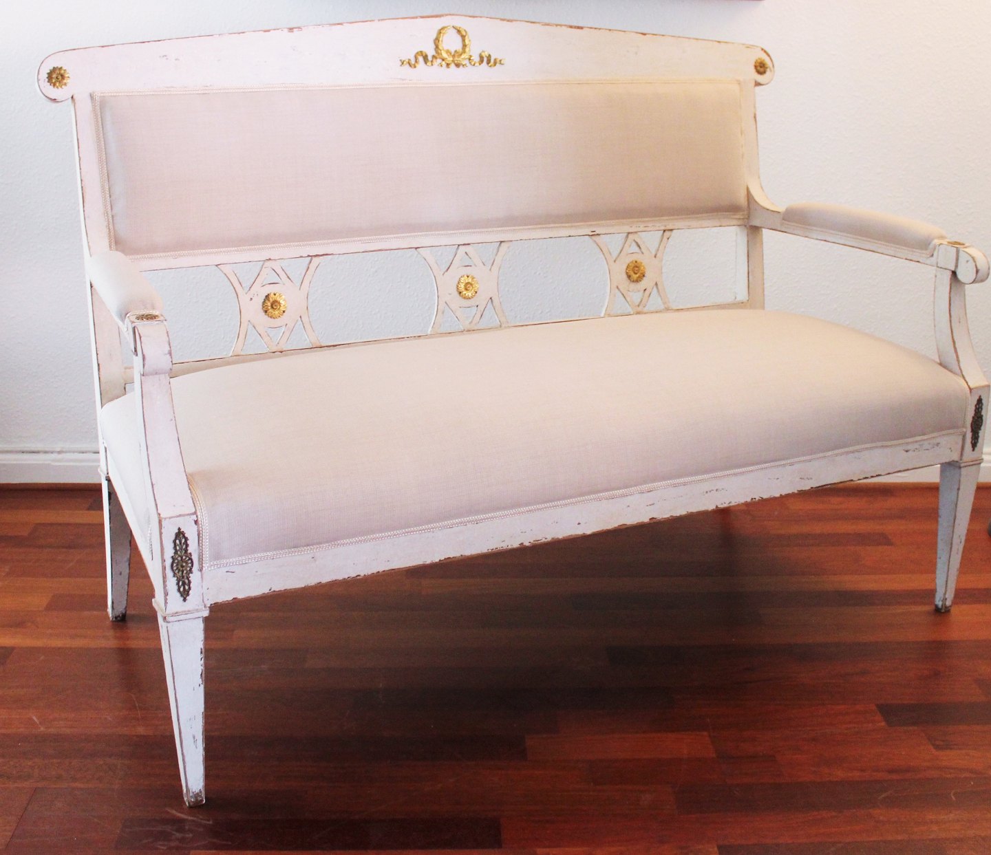 Gustavian set consisting of sofa, side table, two armchairs and two dining chairs, decorated with bronze ornaments. The set is in great vintage condition and from the year 1840.