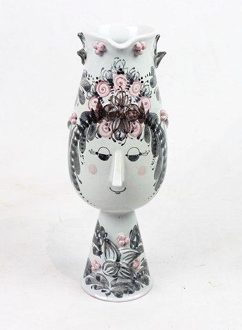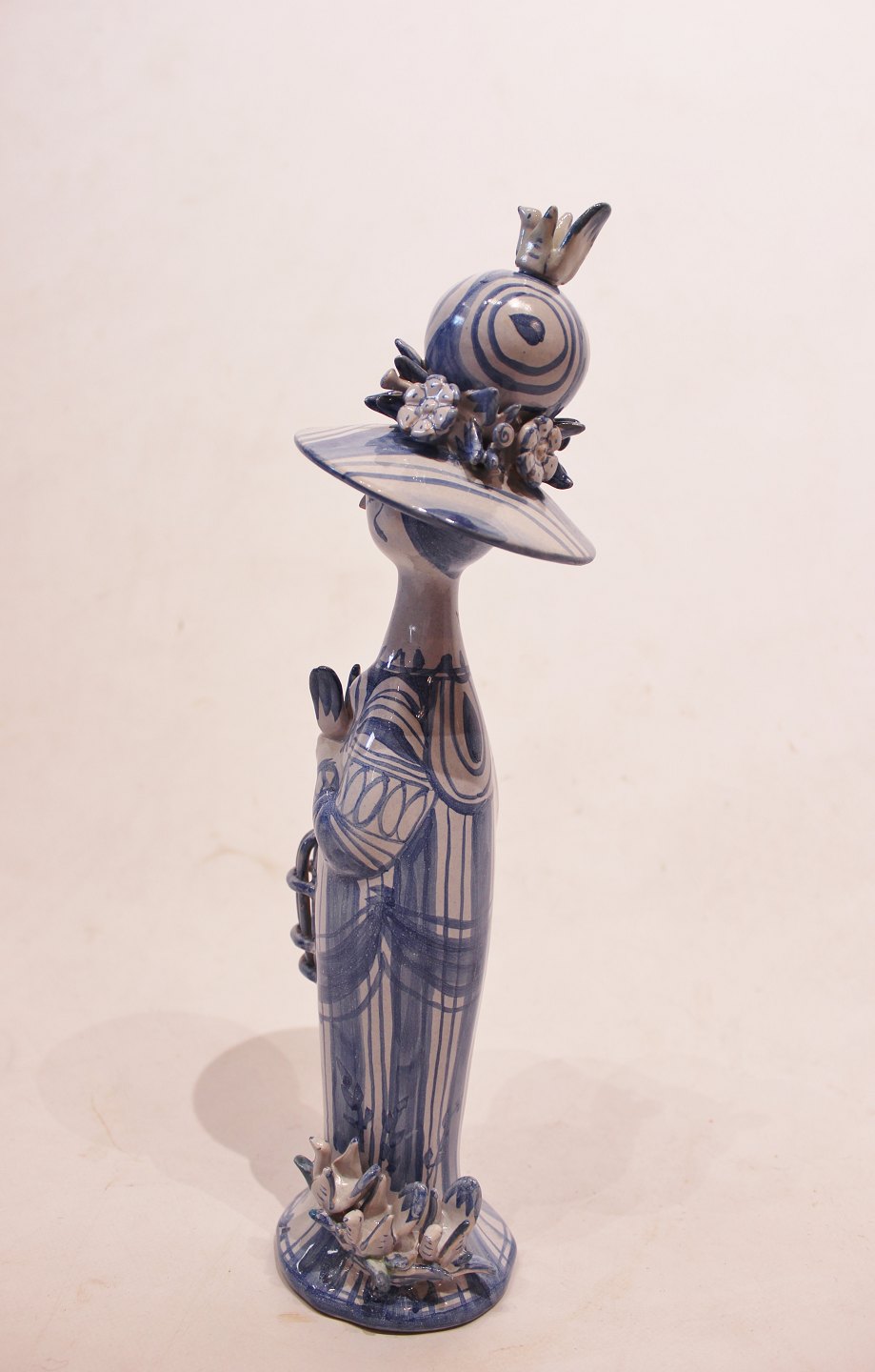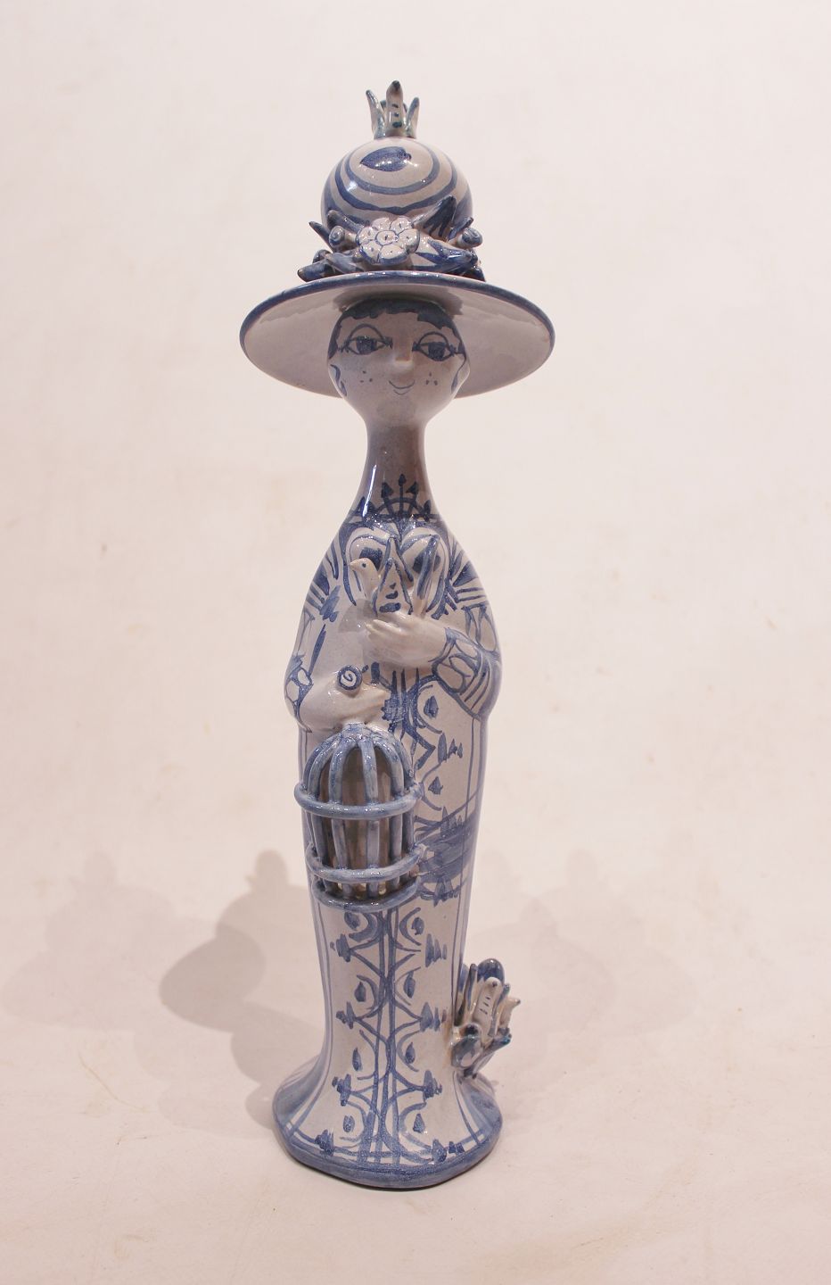 SolgtKeramik figur "Forår", M20, fra serien "De fire årstider" designet af Bjørn Wiinblad. Denne figur blev lavet i 1978 og er dekoreret i blå og hvide farver.