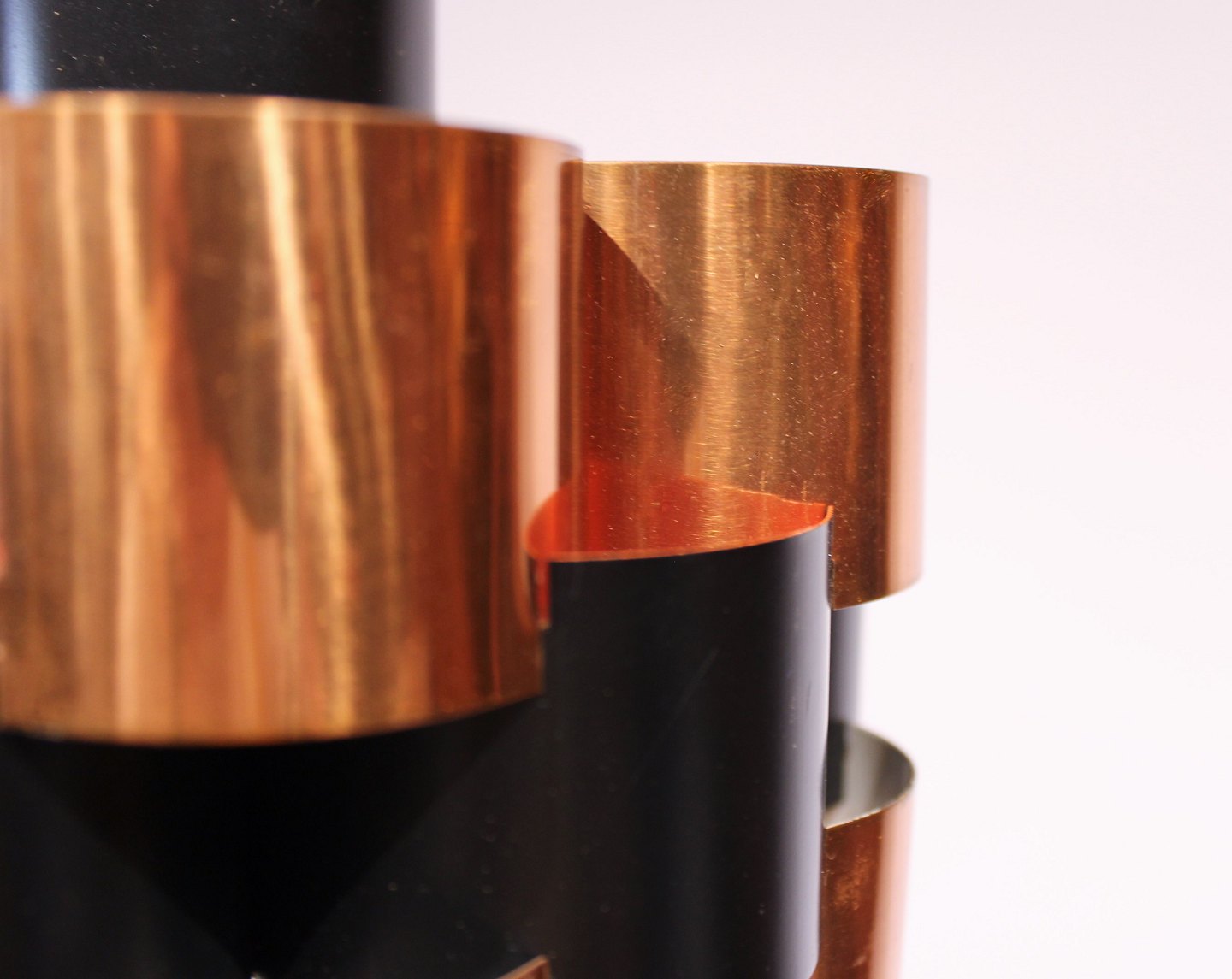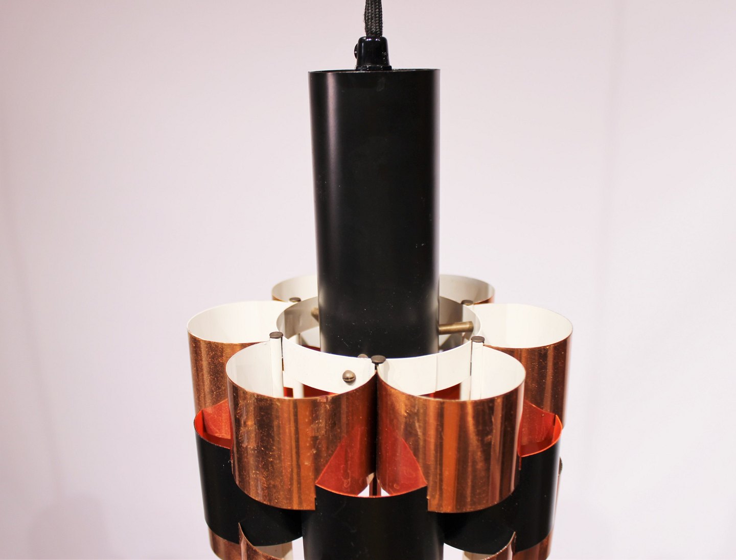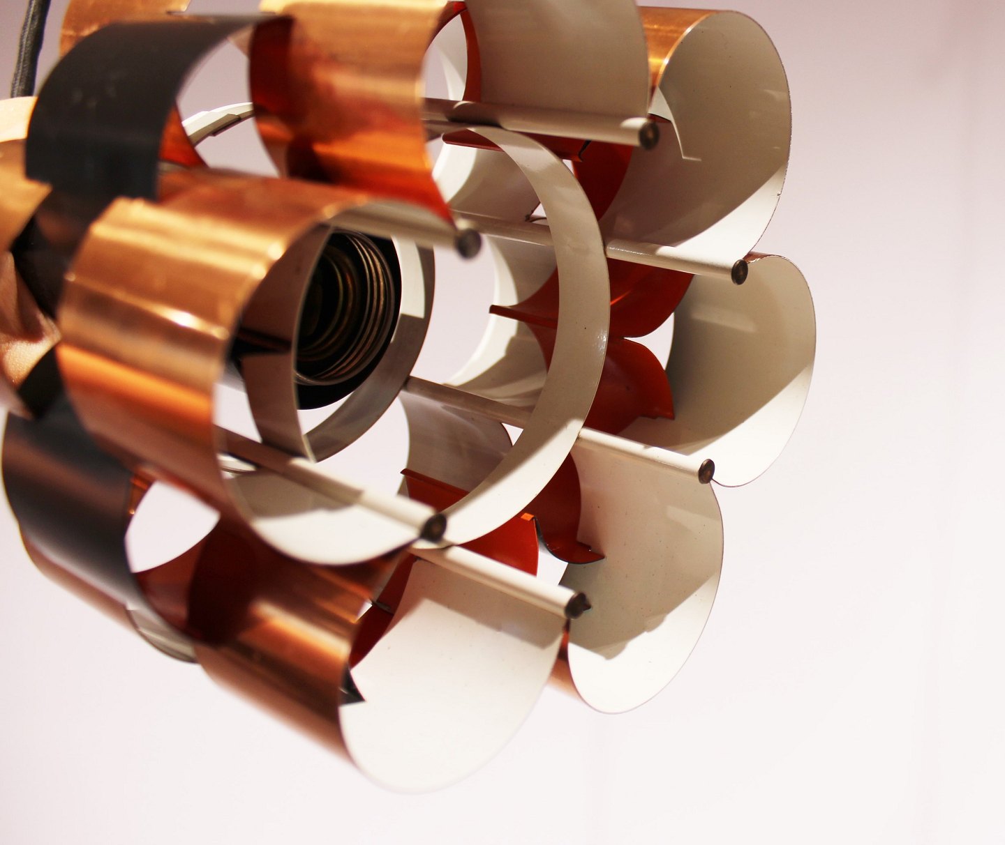 Et par loft pendler af kobber og og sort lakeret metal designet af Werner Schou fra 1960erne. Lamperne er i flot brugt stand.