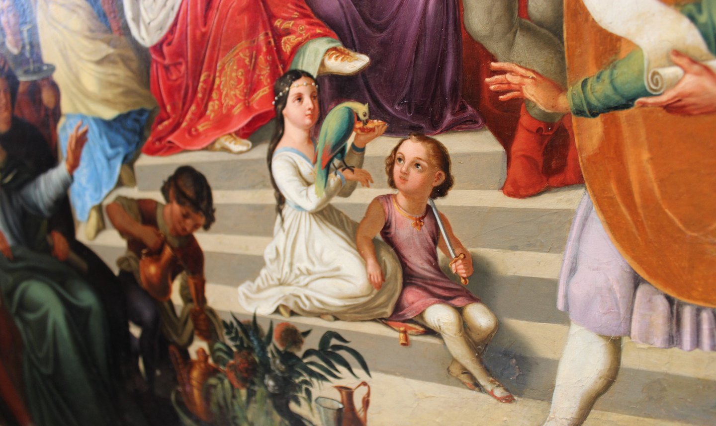 SoldOil painting on canvas from the 19th century by the German painter G. Otti. The painting is called "Der Niebelunge Liet", a scene which probably represents the wedding of Attila and the German princess Ildikó.