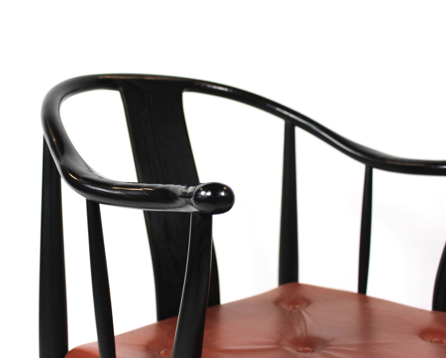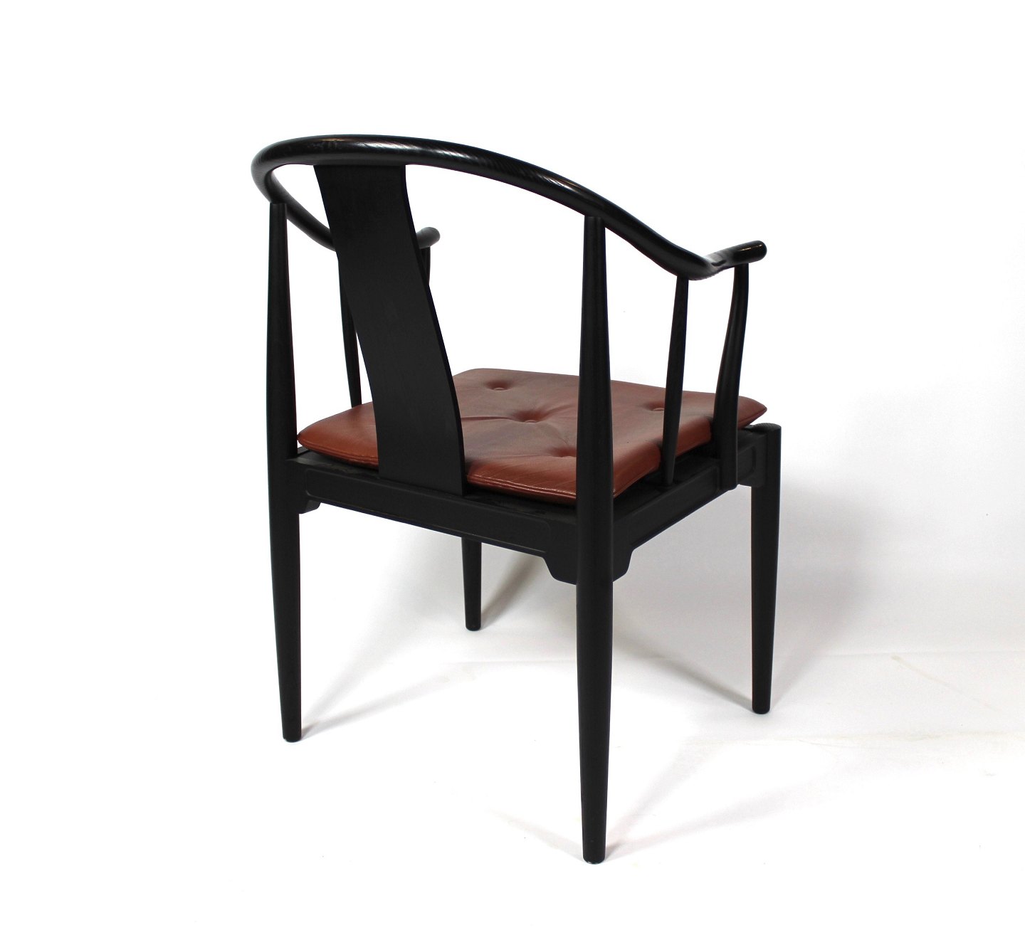 SoldA pair of China chairs of black colored ash and with cushions of cognac colored leather designed by Hans J. Wegner in 1944 and manufactured by Fritz Hansen in 2013. The chairs are in great used condition. Will be sold seperately.
