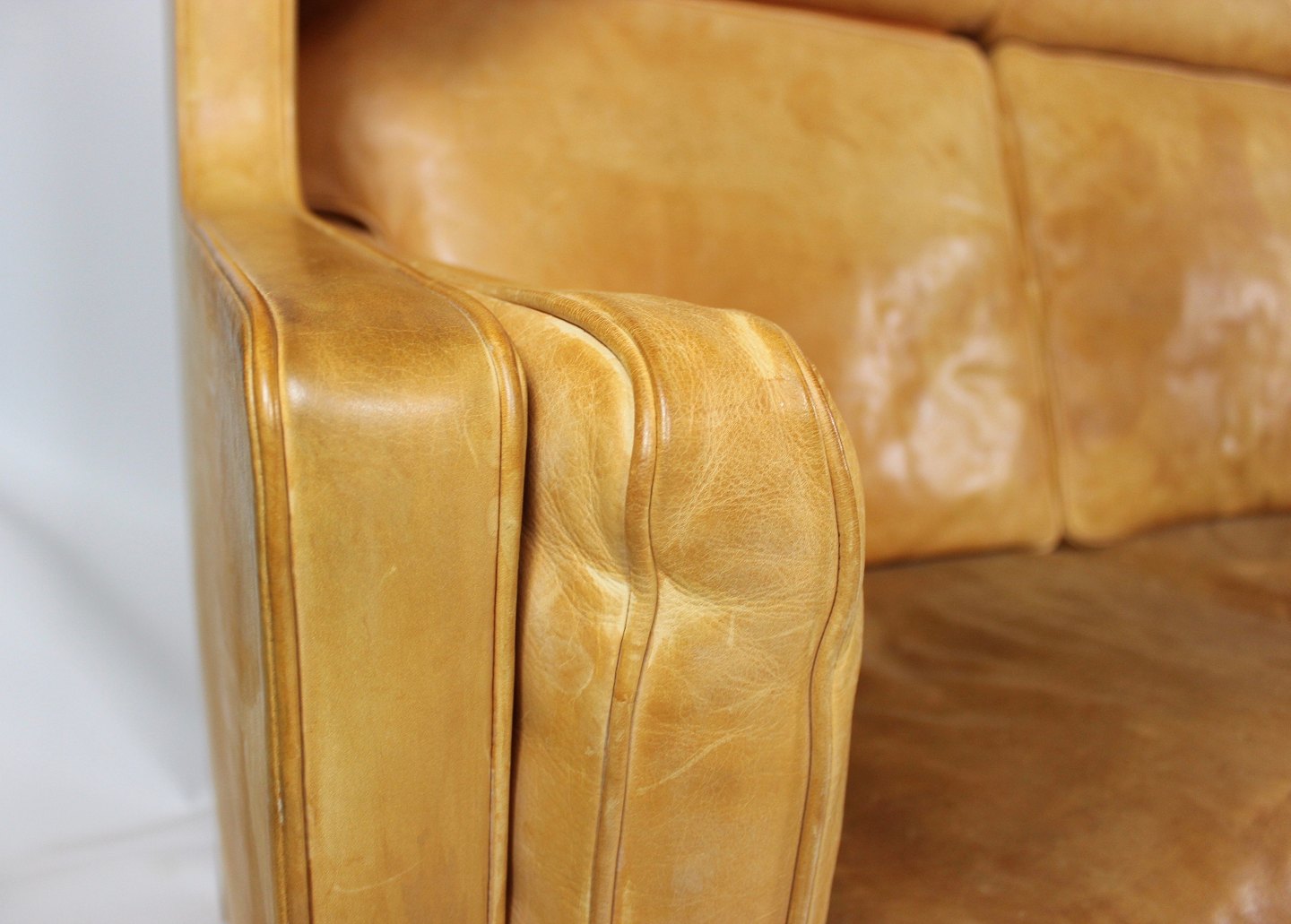 SoldThree seater sofa, model Kupe, designed by Børge Mogensen and upholstered with light cognac colored leather. The sofa is in great vintage condition.
