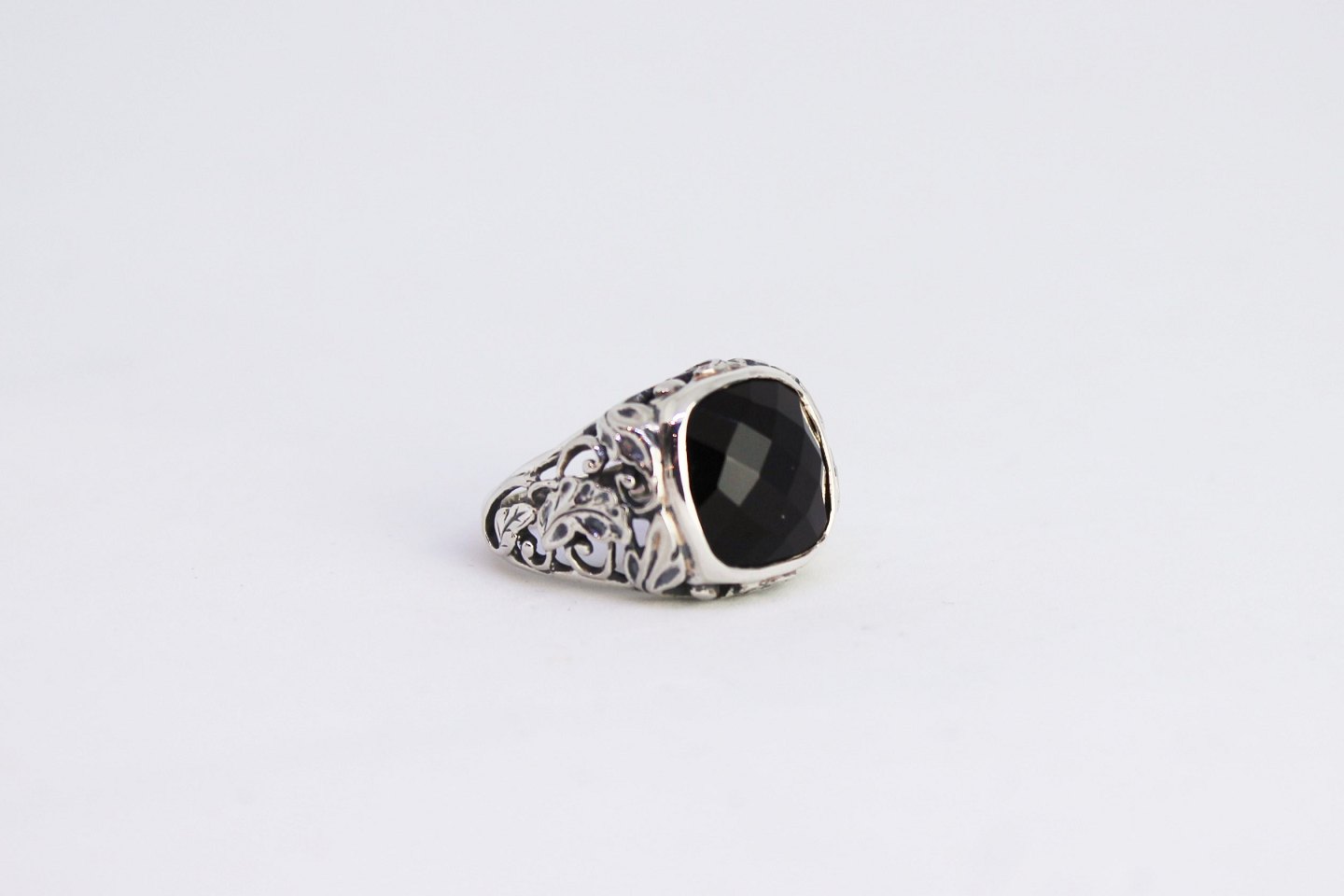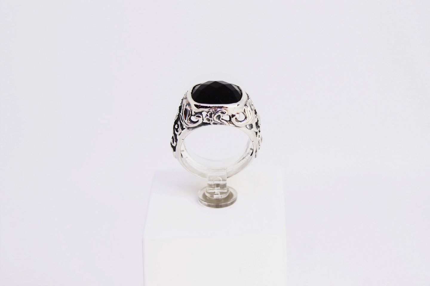 Ring of 925 sterling silver decorated with pattern and black onyx, stamped LUND.