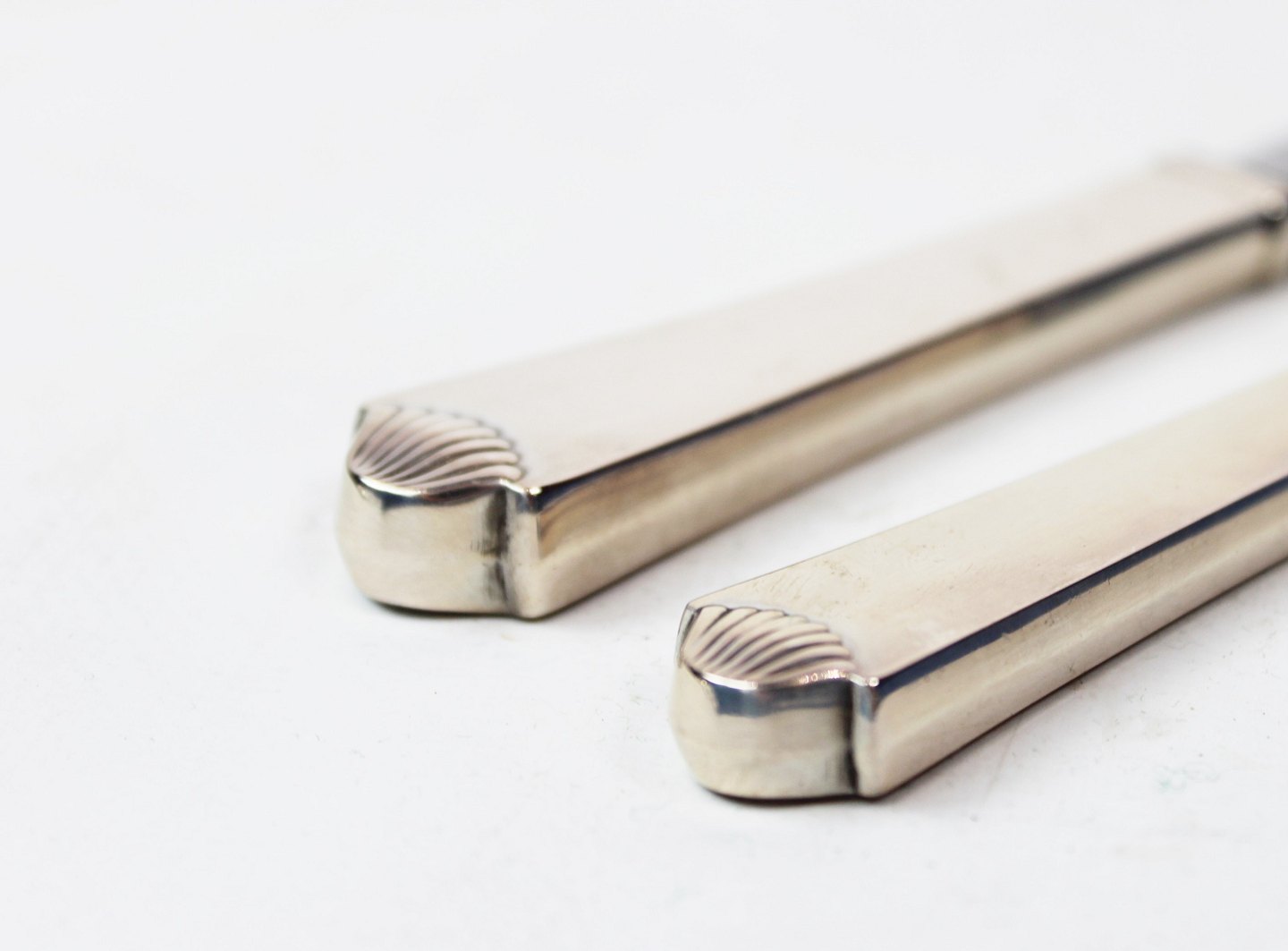 Se prisen i varebeskrivelsenMiddagskniv (650 DKK) og frokostkniv (600 DKK) i arvesølv nr. 4 af Hans Hansen. Spørg for antal på lager.
