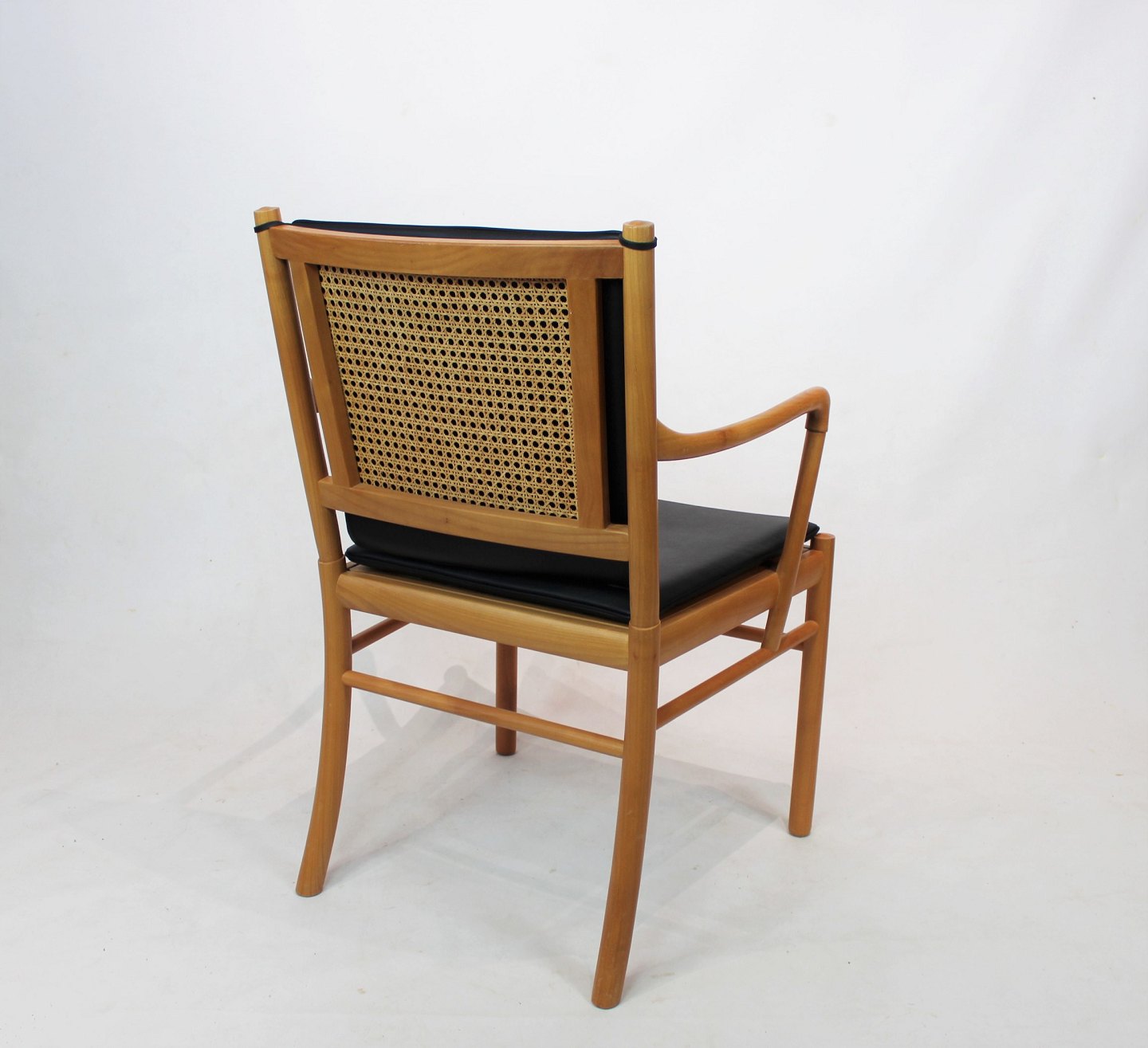 Ole Wanscher is known for his ability to combine classic elegance with functional simplicity, and model PJ-301 is no exception. The chair has a timeless aesthetic with clean lines and a pleasant sitting comfort that makes it suitable for both living rooms and offices. The cherry wood's rich color and fine grain patterns complement the black leather perfectly, resulting in a harmonious and stylish chair.