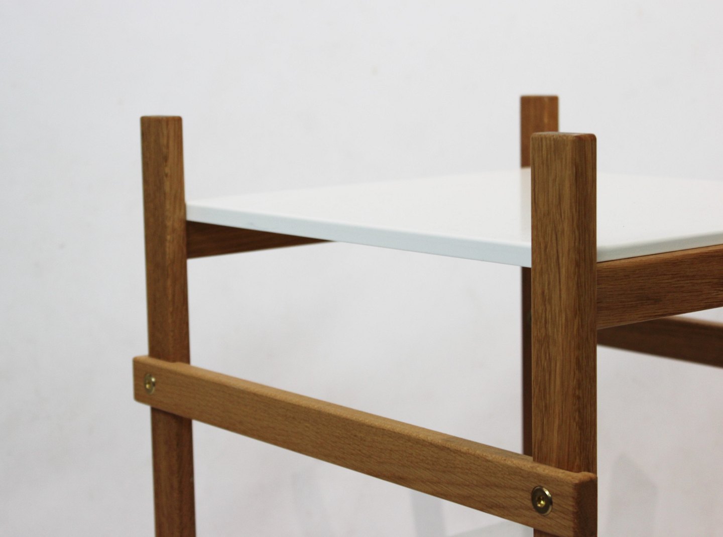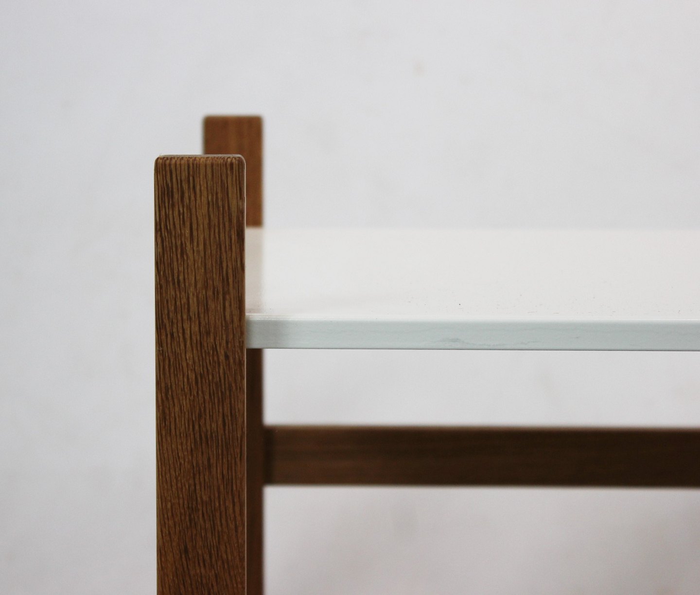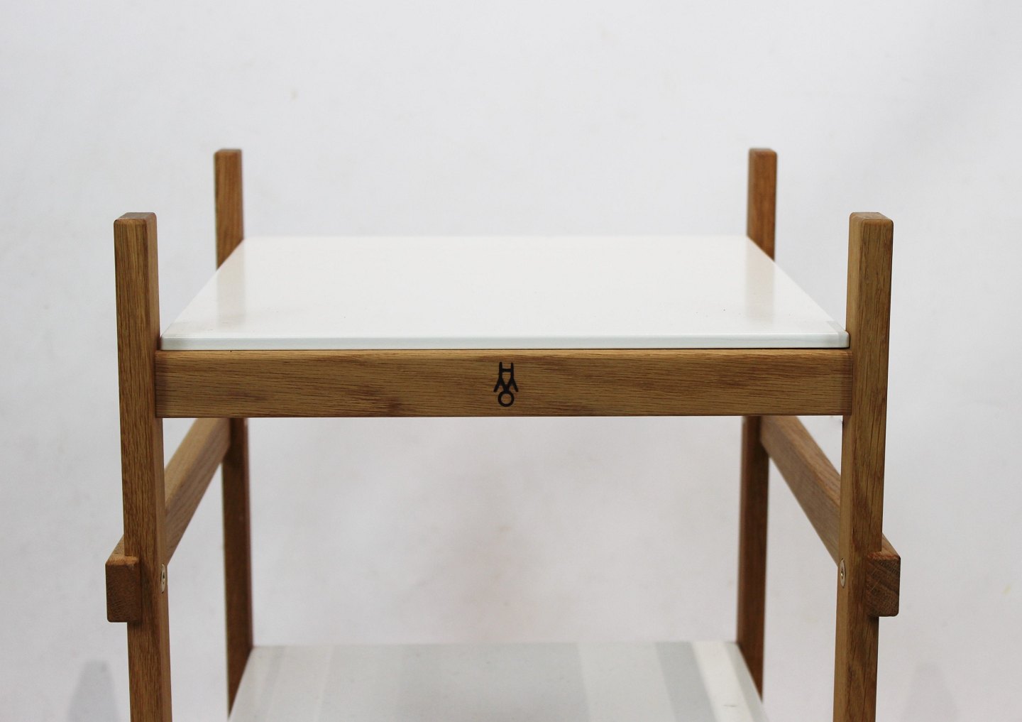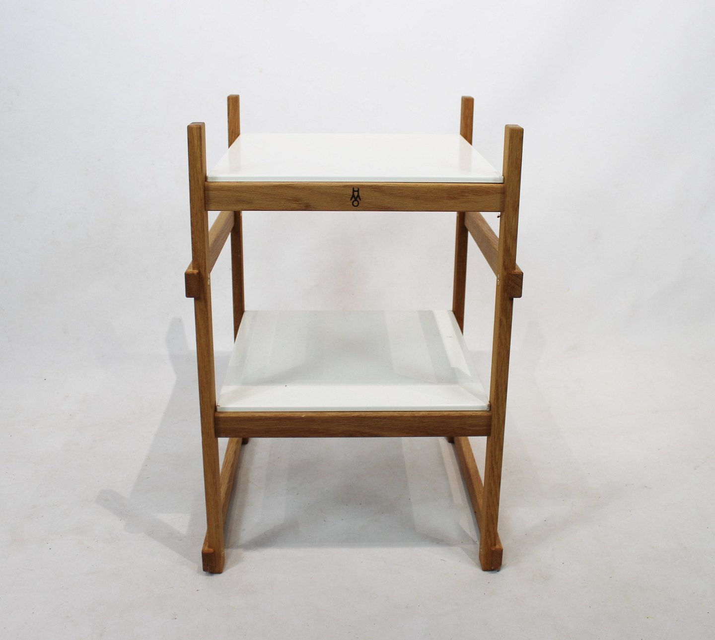Sidebord med hylde af hvid laminat og af ramme af egetræ. Bordet er u fin brugt stand.