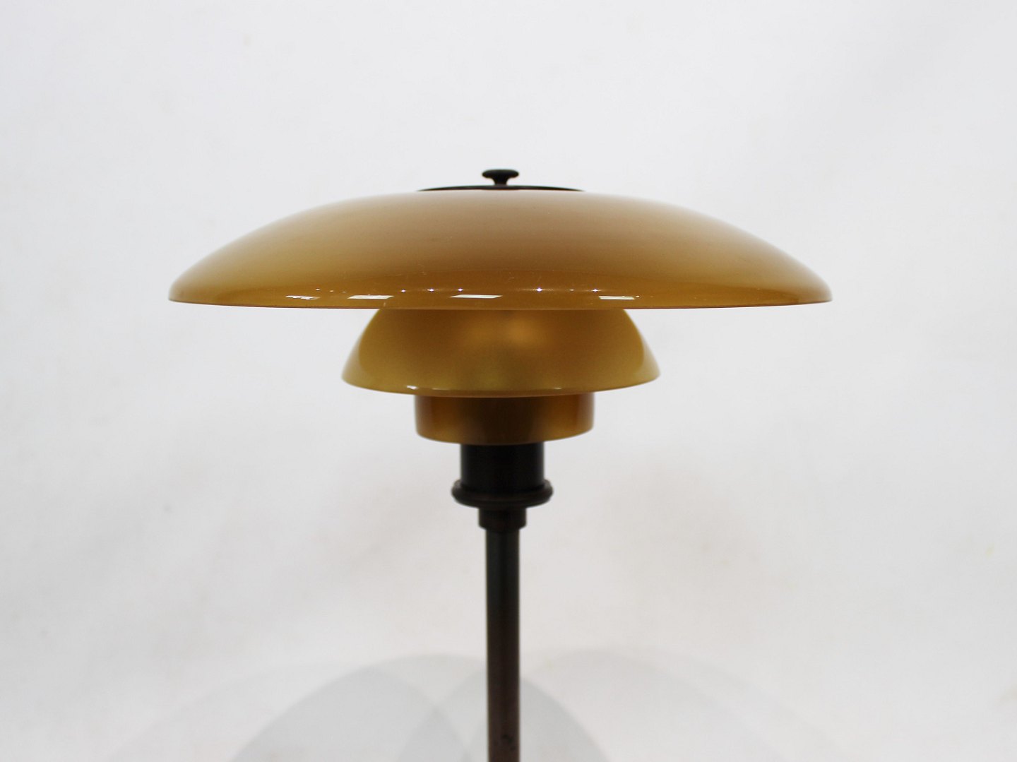 PH 3/2 tablelamp with shades of amber colored glass and frame of burnished brass, designed by Poul Henningsen and manufactured by Louis Poulsen, 1930s.
