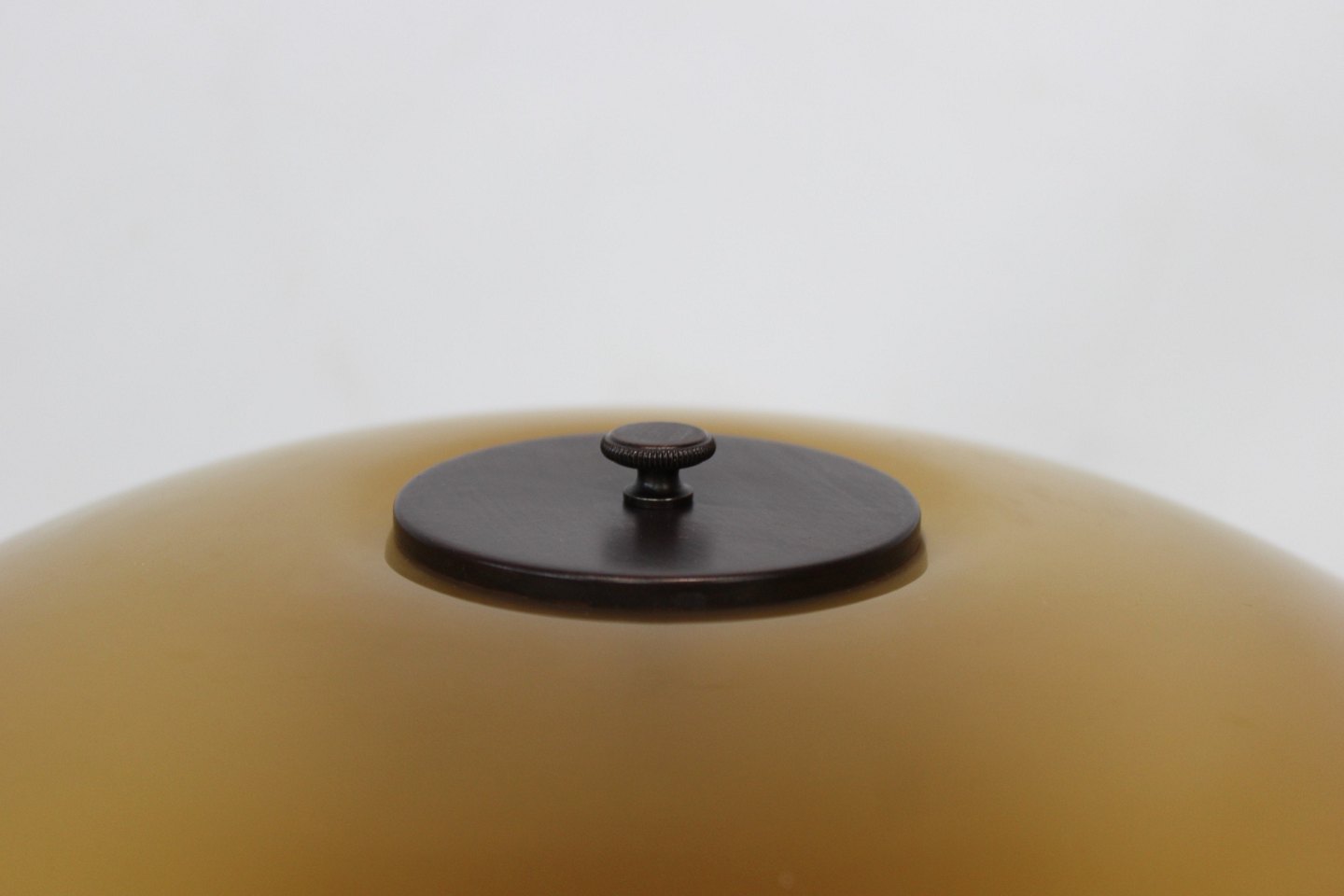 PH 3/2 tablelamp with shades of amber colored glass and frame of burnished brass, designed by Poul Henningsen and manufactured by Louis Poulsen in the beginning of the 1930s. The lamp is in great vintage condition.